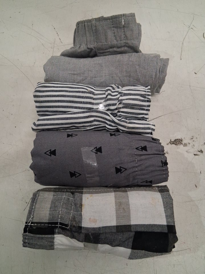 Please note: • One of the expected 5 boxers is missing. • The boxers appear unused but the grey plaid boxers have some orange smudges on them and we recommend washing.