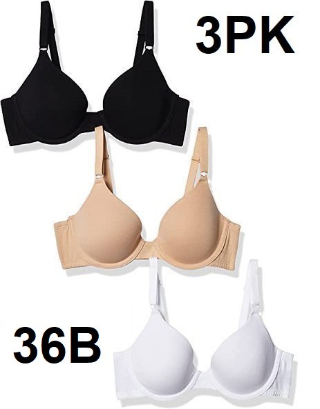 3pk women's fruit of the loom underwire light lined t-shirt bras - 36B - black/white/beige (style: ft797pka)