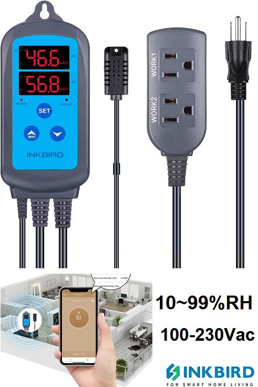 inkbird digital Wi-Fi Dual Outlet Pre-Wired Humidistat Humidity Controller - 100-230vac - 50/60hz - 10-99% relative humidity - grey (model: IHC-200)