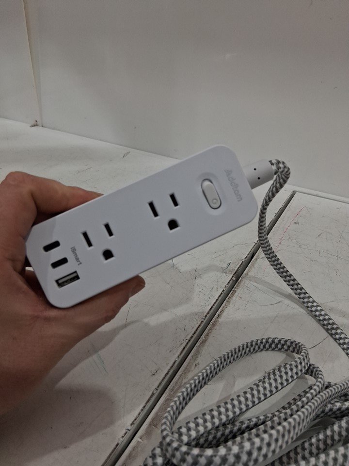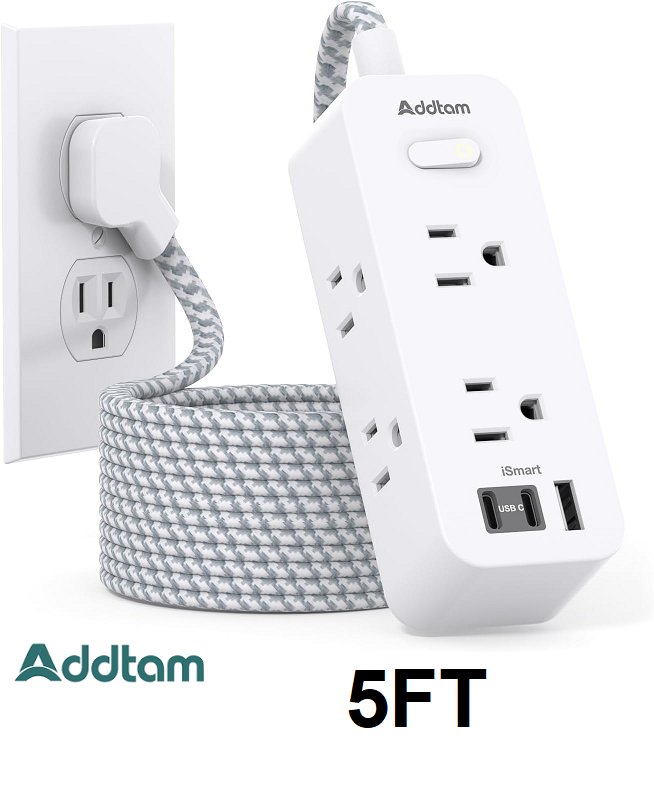 addtam Power Bar Flat Plug Extension Cord Indoor with 6 Outlets and 3 USB Ports(2 USB C) - 5ft - white