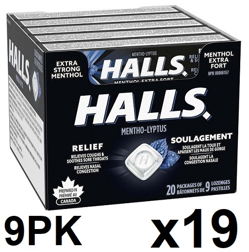 19 (9PK) HALLS Throat Lozenges FOR Sore Throat Relief - Extra Strong MENTHOL (180 total)
