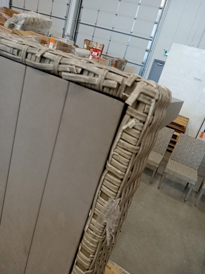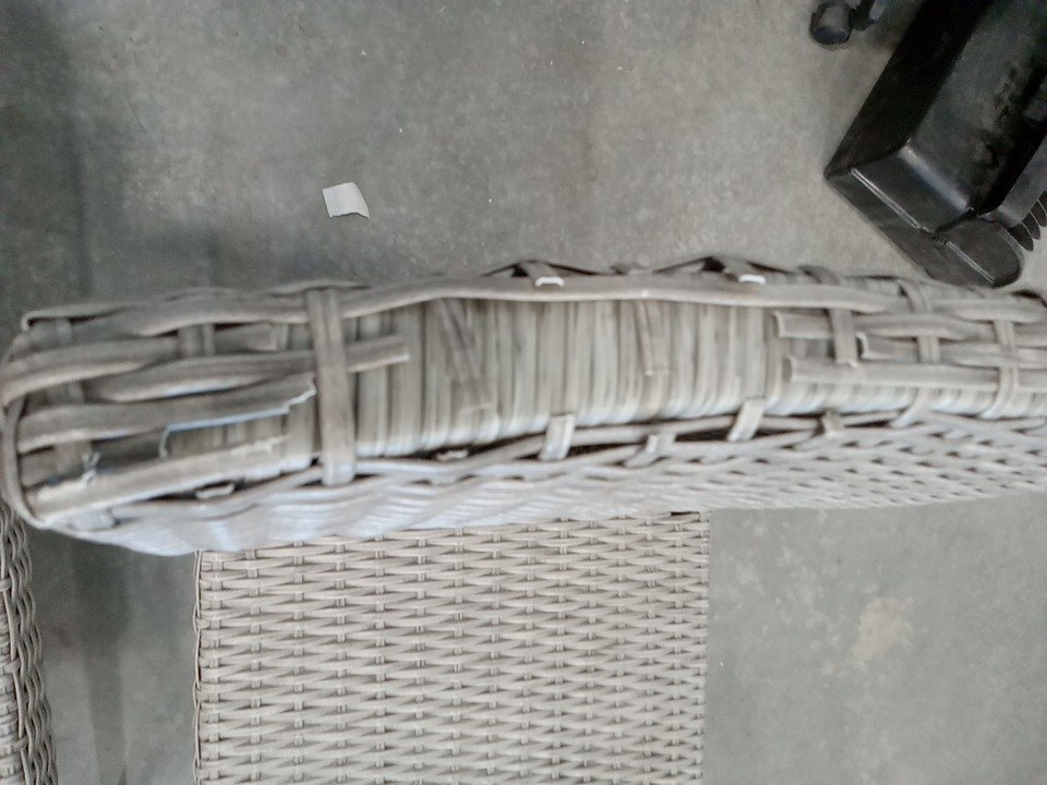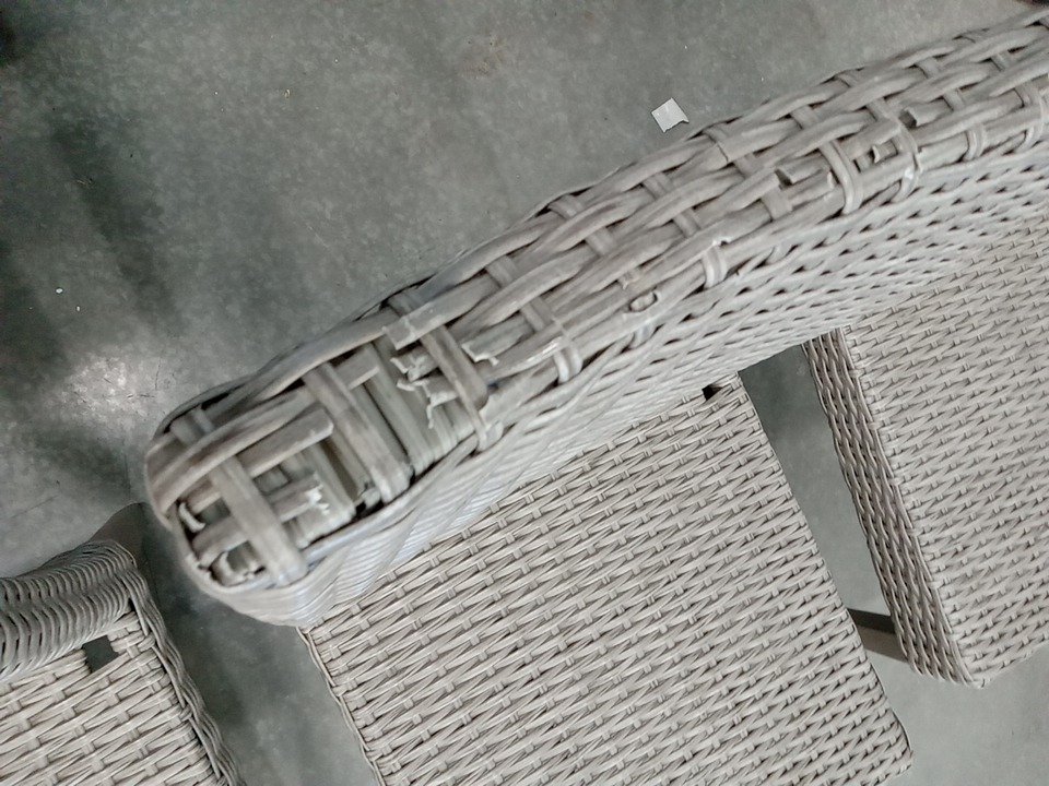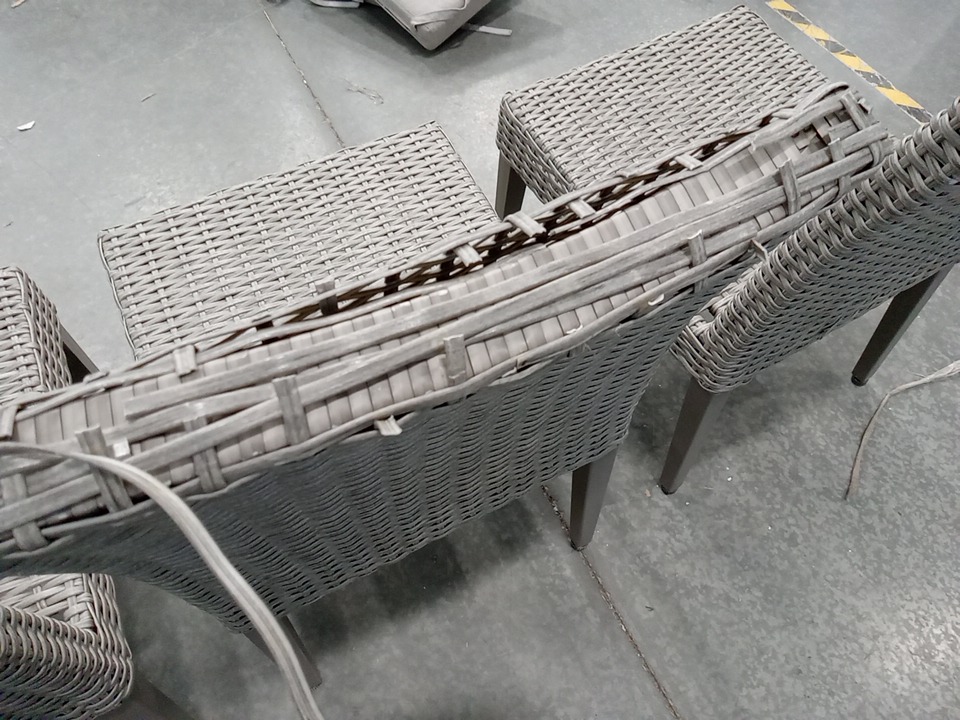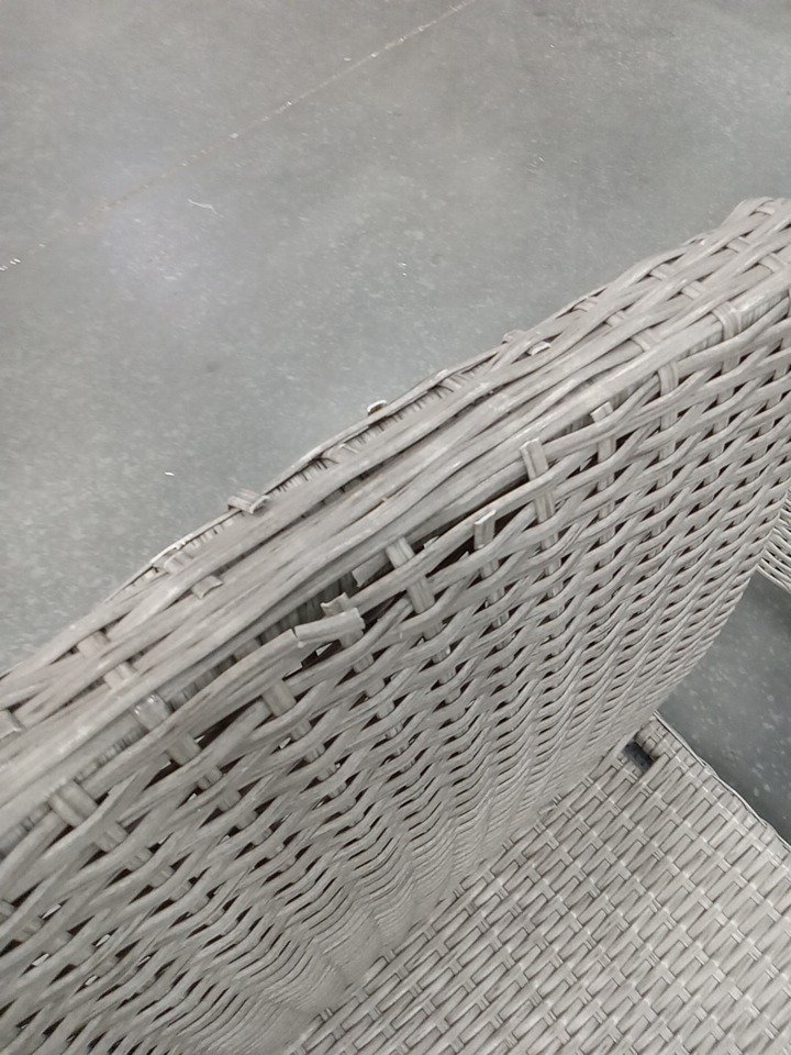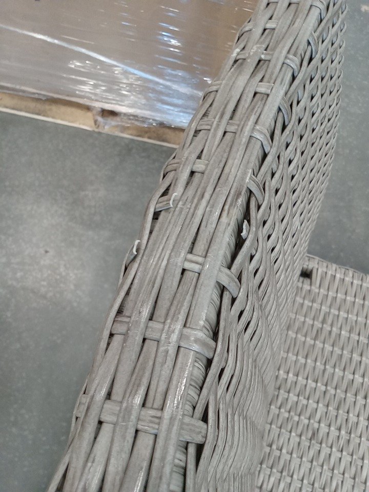 Item has scuffs, stains and fading present from previous use, the wicker strands are broken on some chairs and corners of the table. Cushion are dirty from loose shipping/storage. Please note this item is big bring appropriate vehicle and help at the time of pick up.