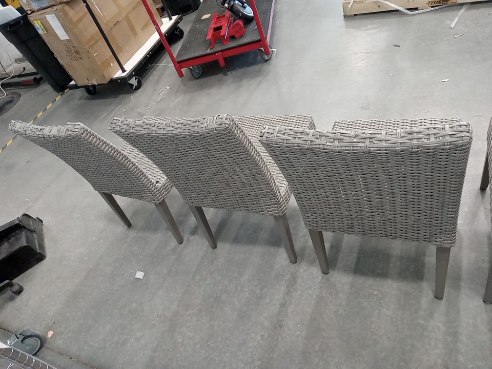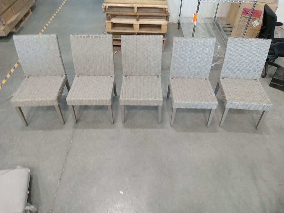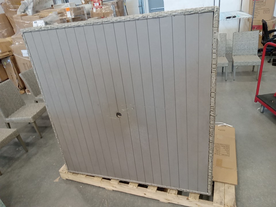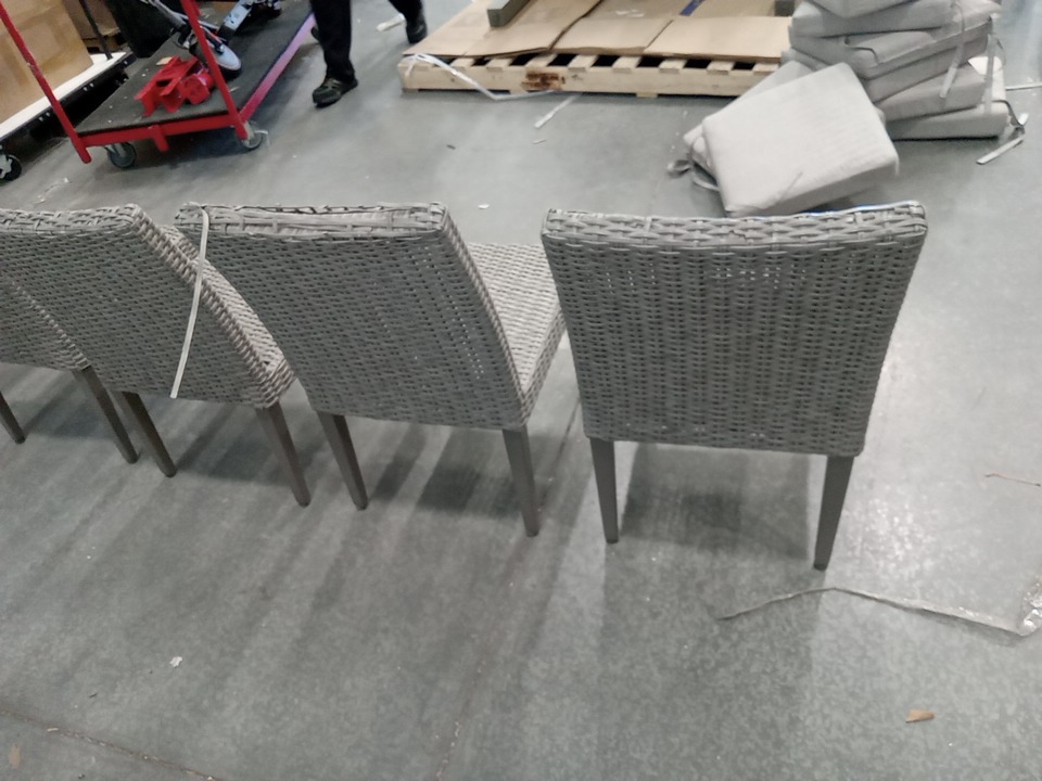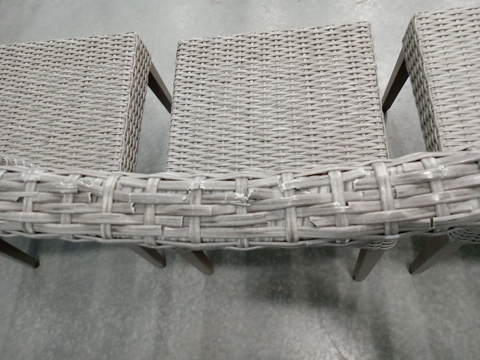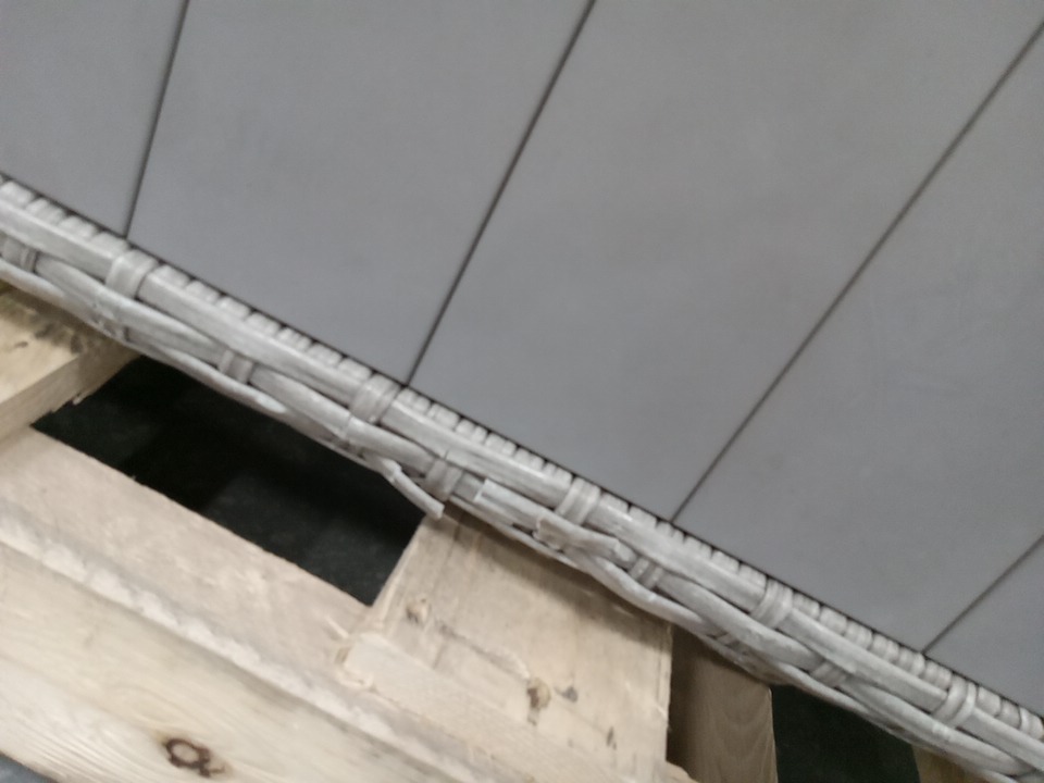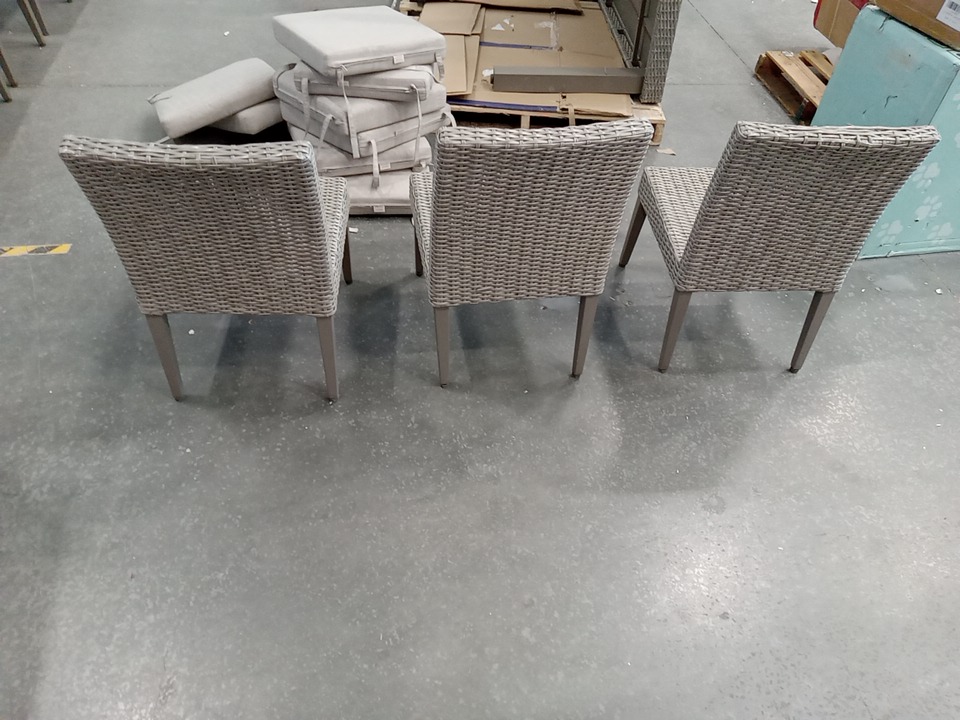 Item has scuffs, stains and fading present from previous use, the wicker strands are broken on some chairs and corners of the table. Cushion are dirty from loose shipping/storage. Please note this item is big bring appropriate vehicle and help at the time of pick up.