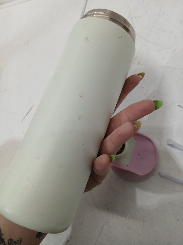 possibly coffe stains on the ouside of the bottle lid is dirty the handle has broken off missing straw