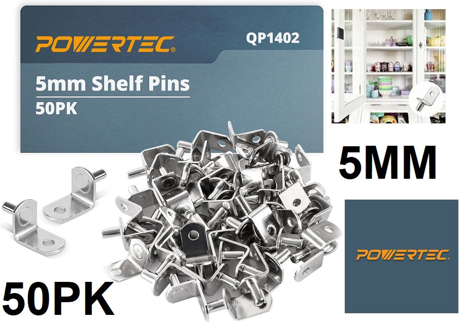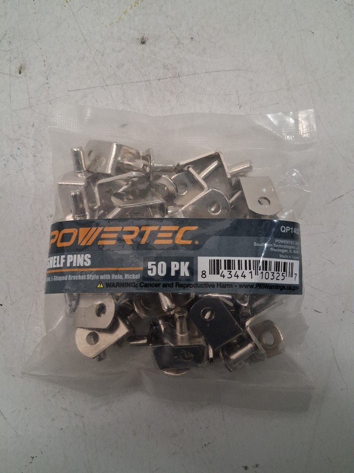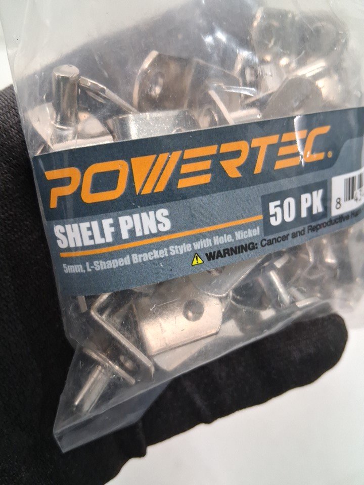 50pk powertec shelf pins, l shaped bracket style with hole - 5mm - nickel (model: qp1402)