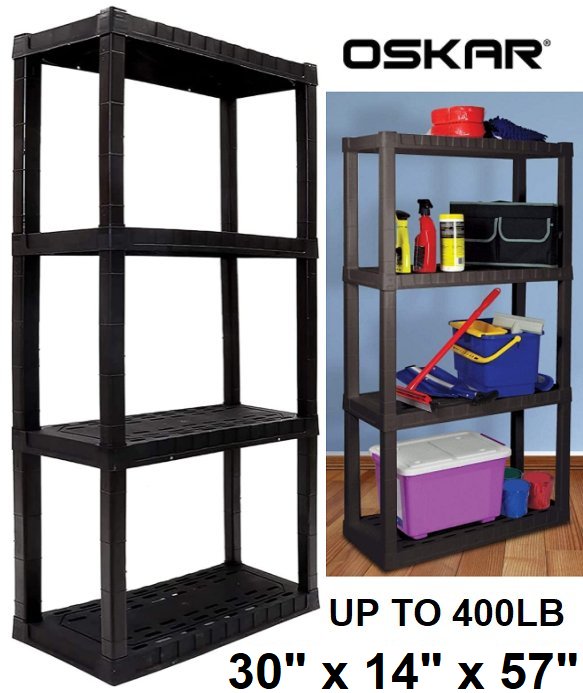 KOOLATRON OSKAR HEAVY DUTY 4-TIER PLASTIC UTILITY SHELF - 400LB CAPACITY / 30"wx14"dx57"h - BLACK