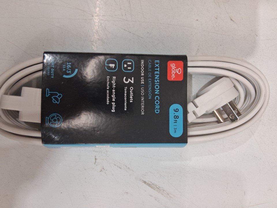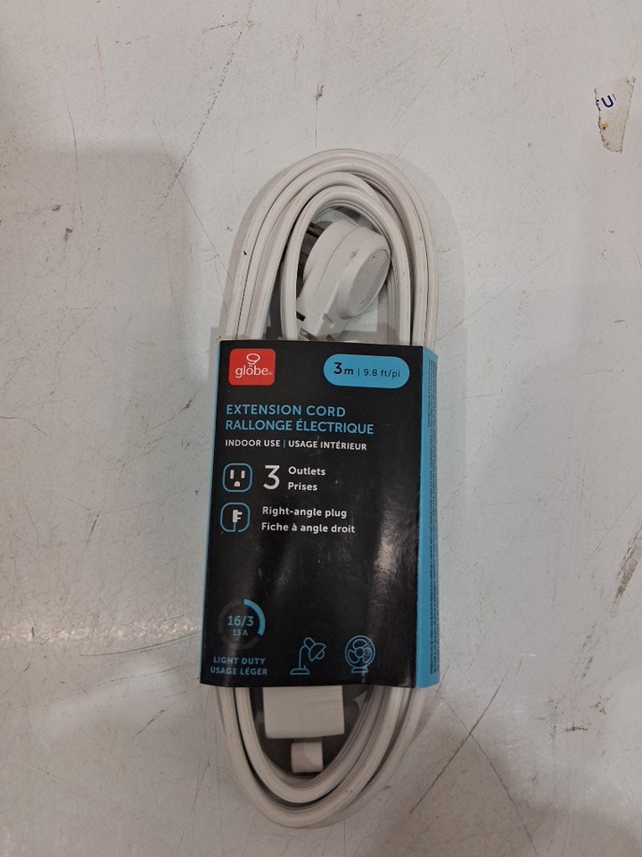 GLOBE ELECTRIC 3-OUTLET INDOOR EXTENSION CORD WITH RIGHT-ANGLE PLUG - GROUNDED - 9.8FT - WHITE