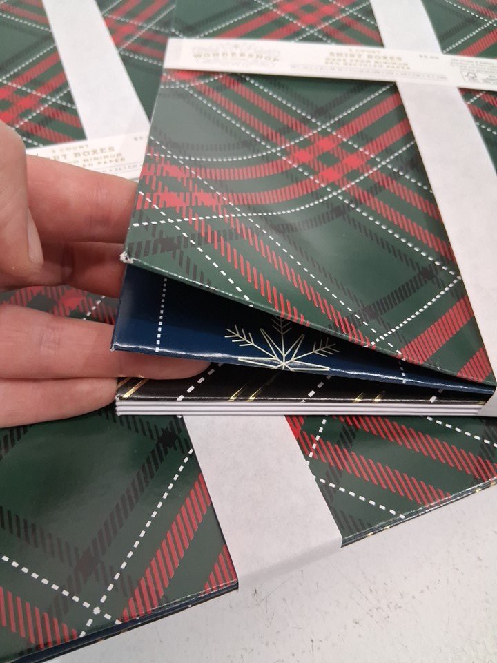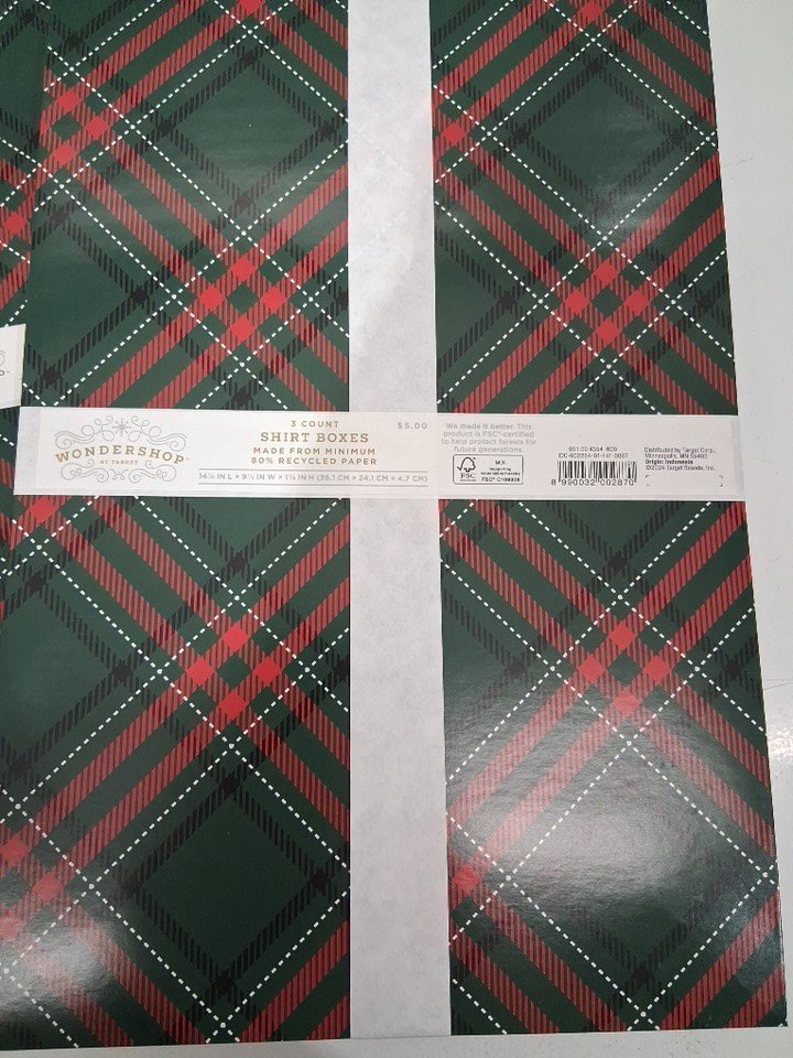 4 (3PK) wondershop christmas gift shirt boxes - 14.3" x 9.5" x 1.8" - red & green plaid / blue snowflake / black & gold stipes