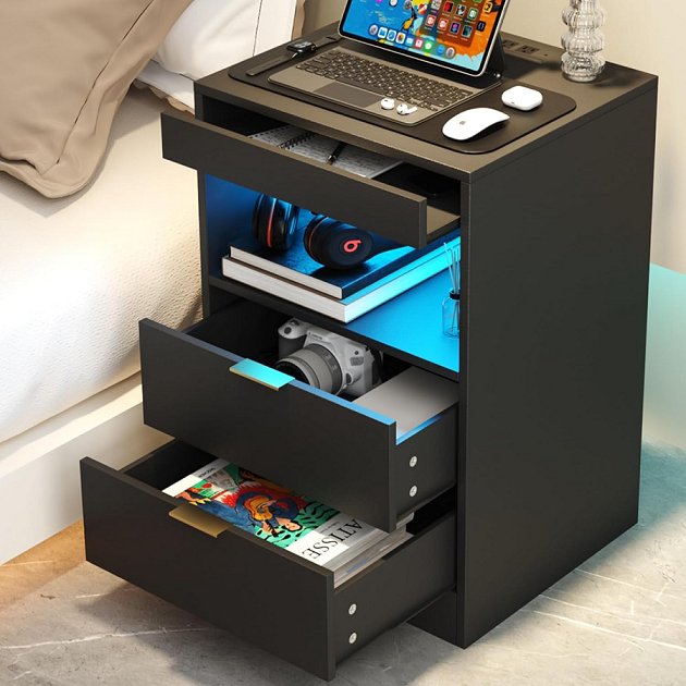 GADROAD Nightstand with LED Lights AND Charging Station Black (MODEL: pg-02NS011A-bpn03)