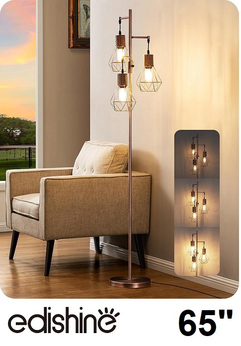EDISHINE ADJUSTABLE 3-LIGHT INDUSTRIAL STANDING FLOOR LAMP WITH ROTATING CAGE HEADS - 65" - BLACK (MODEL: HoFL03g1)