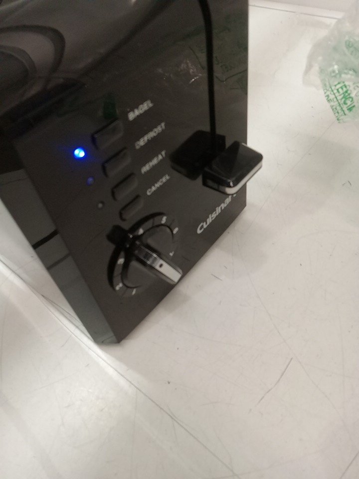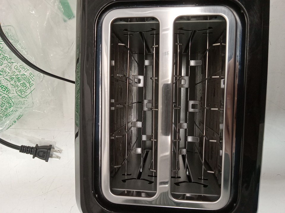 Food debris in the toaster from previous use, can likely be cleaned. Tested for power/heat only.