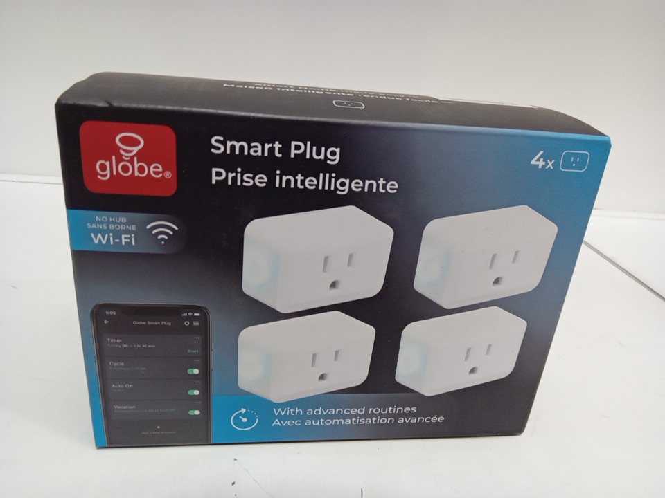 4PK Globe Electric Wi-Fi Smart Plug, no hub required, Compact design, In-App Timer, Cycle, Auto Off and Vacation controls (MODEL: 1533646)