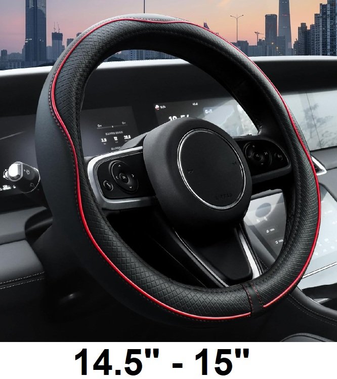 ouzorp car steering wheel microfiber leather cover - 14.5" - 15" - black/red lining