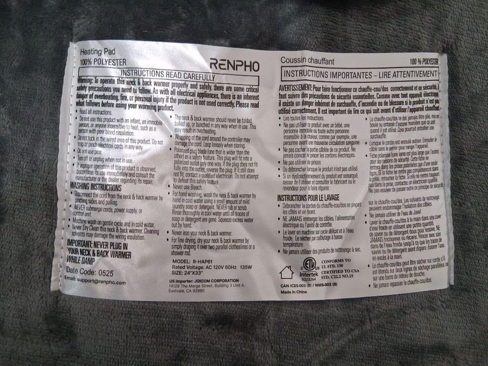 Renpho Heating Pad for Neck, Shoulder, and Back Pain Relief and Tie Straps - 24" x 33" - Grey (Model: R-HAP61)