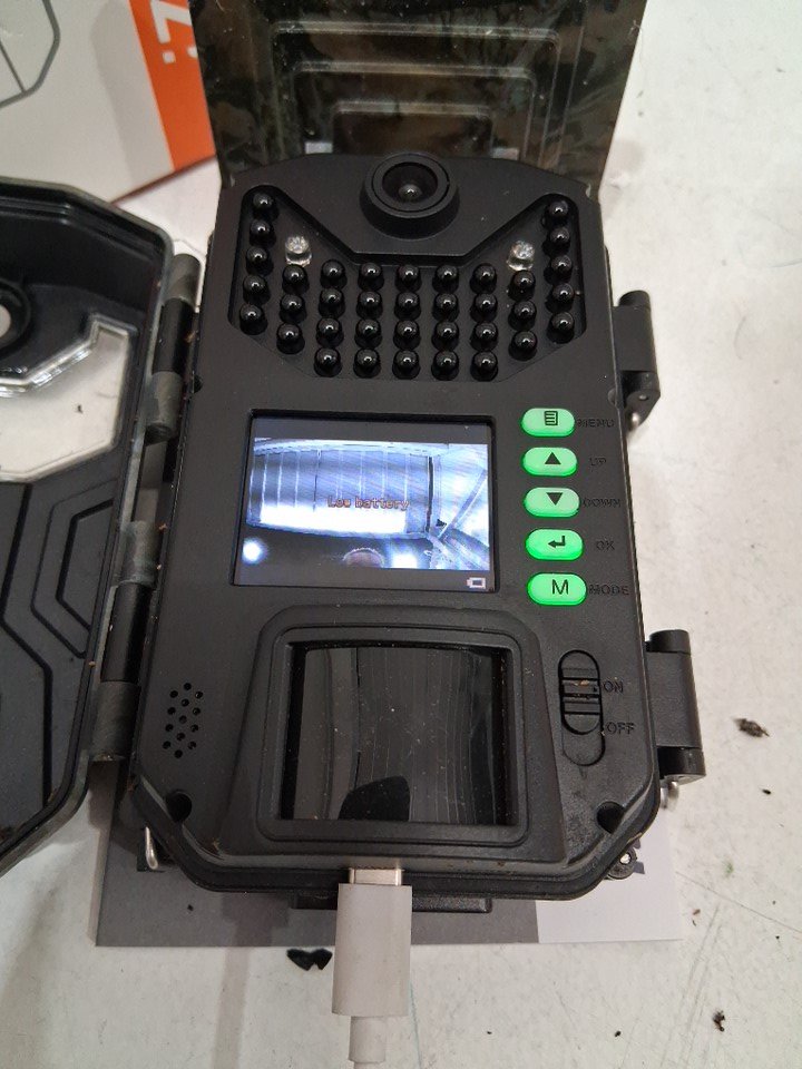 missing USB-C charging cable and tree strap, tested for power, will need to fully charge before use