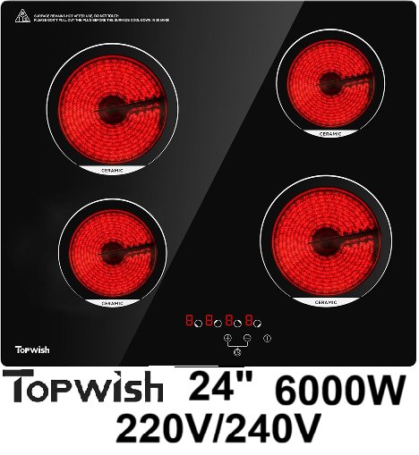 topwish drop-in electric cooktop with 4 burners, touch control, safety lock and timer - 220v/240v 6000w - 24" - black (model: ach-cl4)