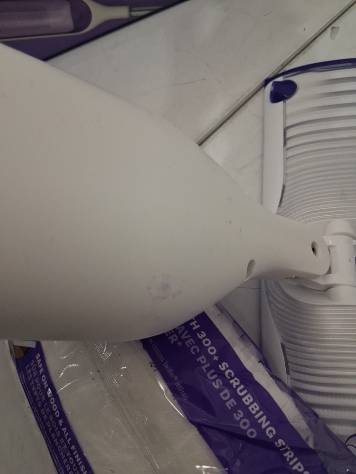 Powermop has scuff marks on it. cleaner is unused and mop heads and batteries are sealed