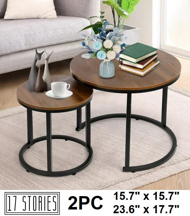 2PC 17 Stories Coffee Table Nesting Side Metal Frame Wood Desk - 15.7" x 15.7" AND 23.6" x 17.7" - BROWN - (MODEL: ZY2016)