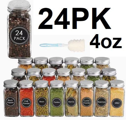 24PK SQUARE GLASS SPICE JARS WITH LABELS AND CLEANING SPONGE - 4oz - Clear/silver