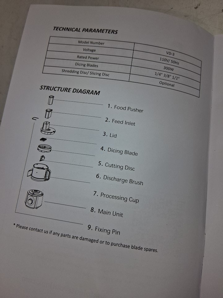 there are some food marks from use inside processor, and the vegetable cover has a broken piece on the top. Item was also tested for power use only, see all photos.