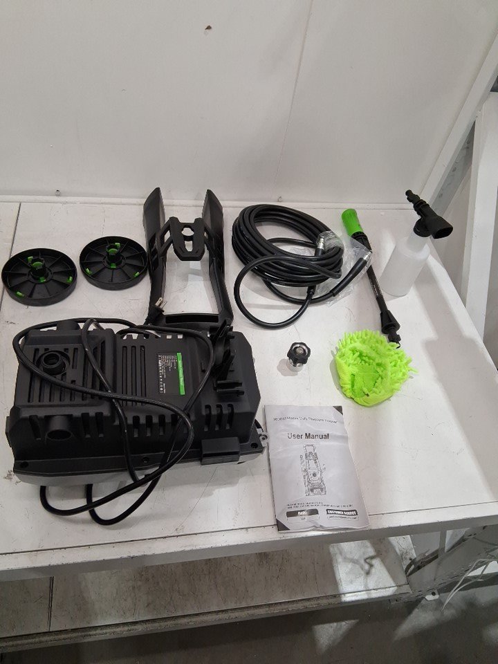 Water came out of the item during inspection, indicating prior use. The item is missing the high-pressure gun and nozzle; see photos.