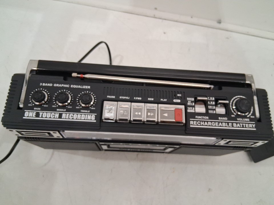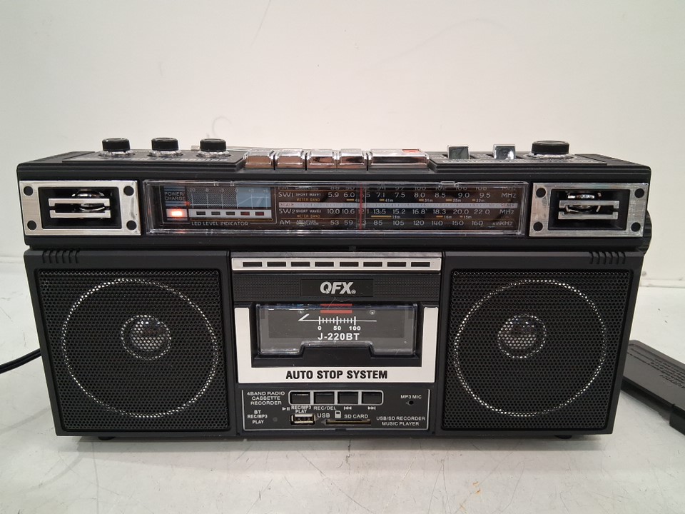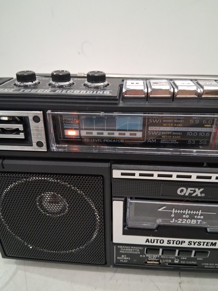 QFX ReRun Cassette Player Boombox with 4-Band Radio, MP3 Converter, and Bluetooth - black - (model: J-220BT)