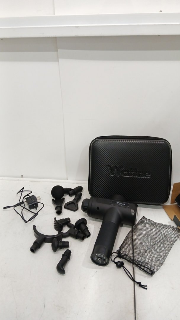 WATTNE MASSAGE DEEP TISSUE PERCUSSION MASSAGE GUN WITH ASSORTED ATTACHMENT HEADS - BLACK - (MODEL: W2/RC-MG-010)