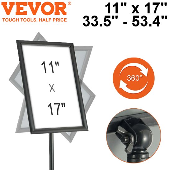 VEVOR Heavy-Duty Floor Standing Sign Holder with Round Base And 360° ROTATION - 11" x 17" x 33.5" - 53.4" - MATTE BLACK (MODEL: SW-02)
