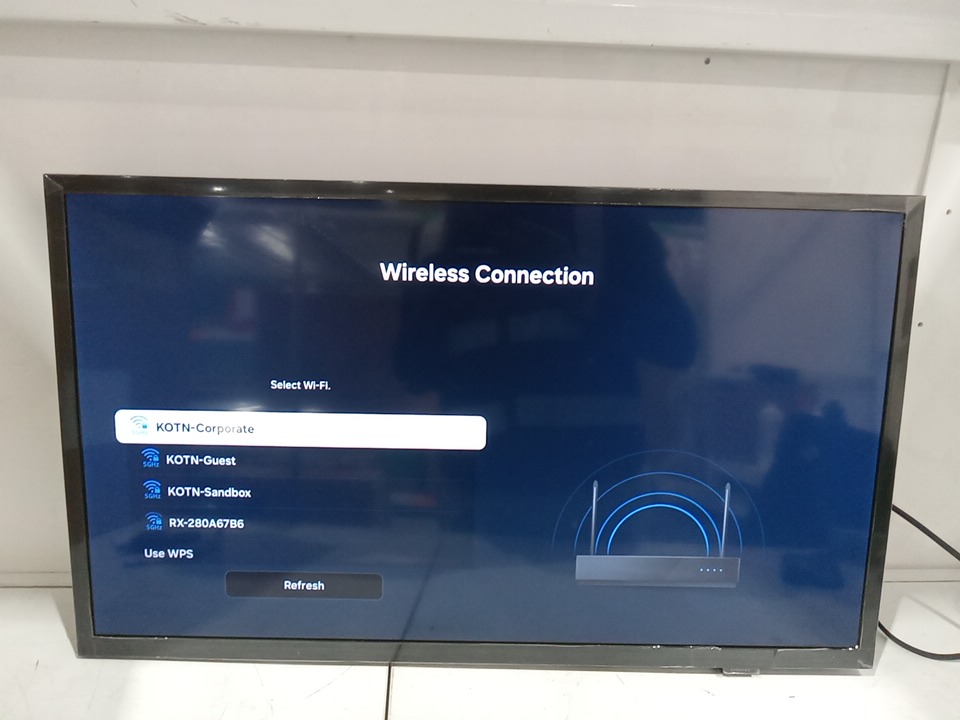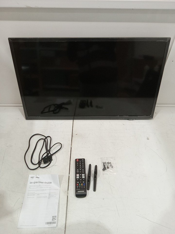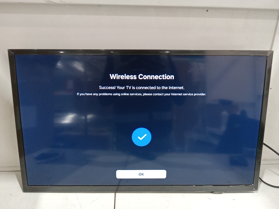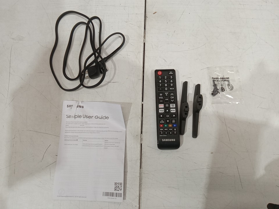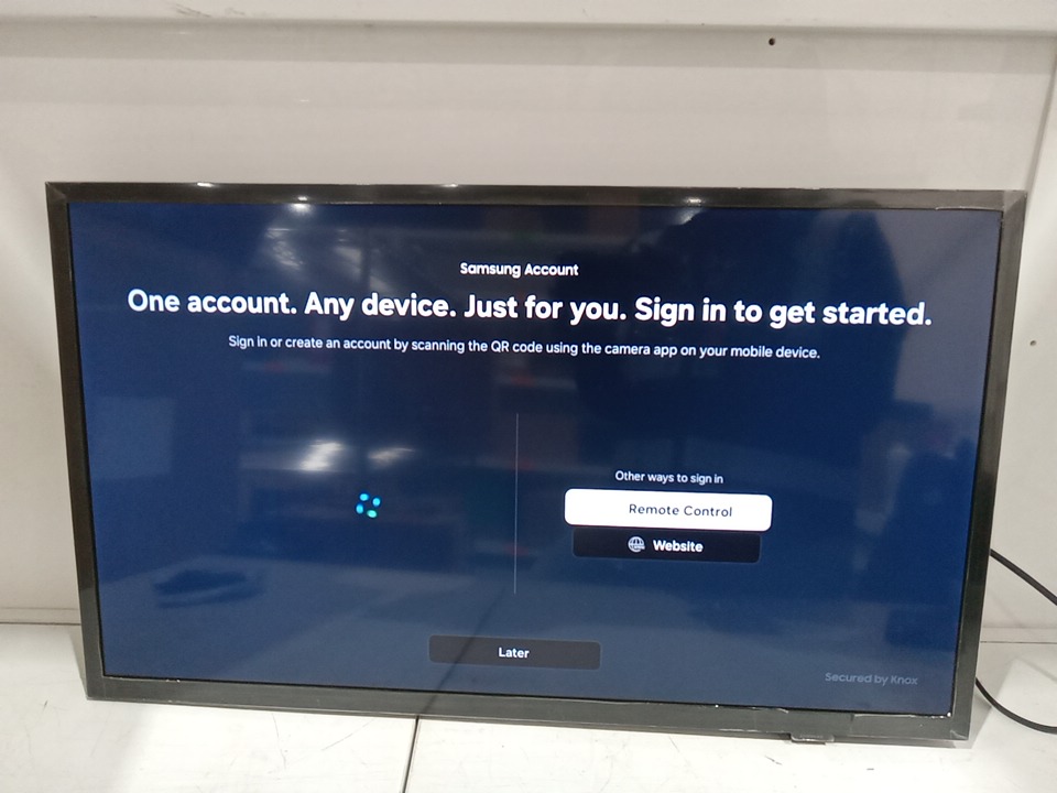 Please note that the product cannot be factory reset, despite multiple attempts and alternative methods. The TV does not have any account currently logged in; however, it can still connect to Wi-Fi and a Samsung account can be added. There are minor scratch marks near the ports from previous use. Tested for power and functionality. (Please see photos)