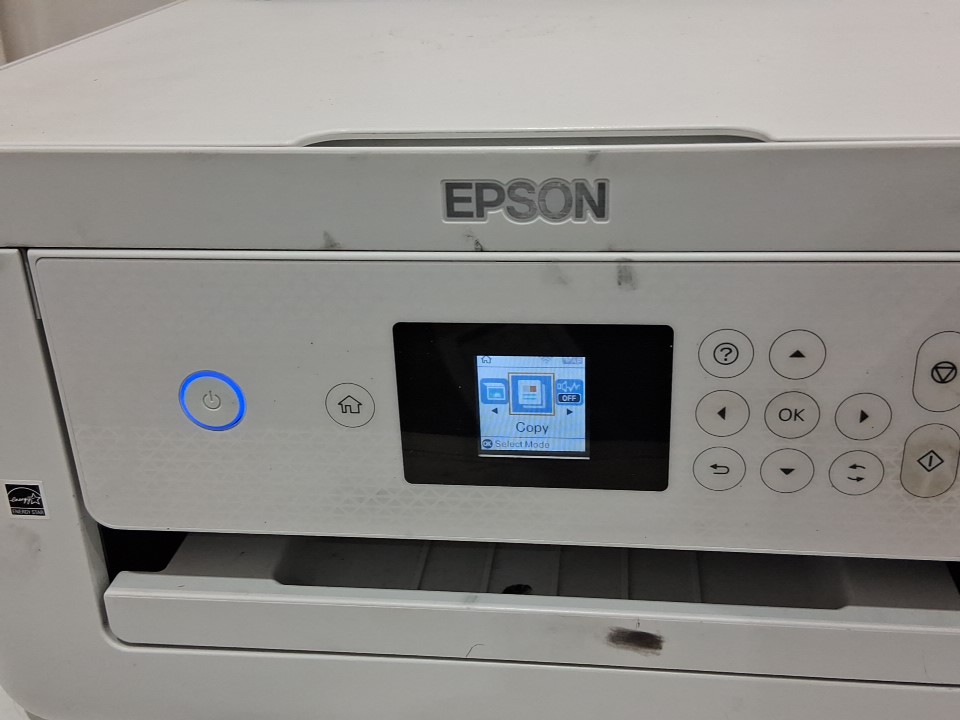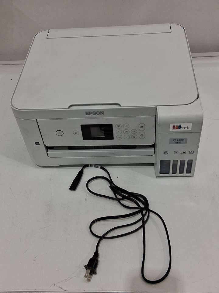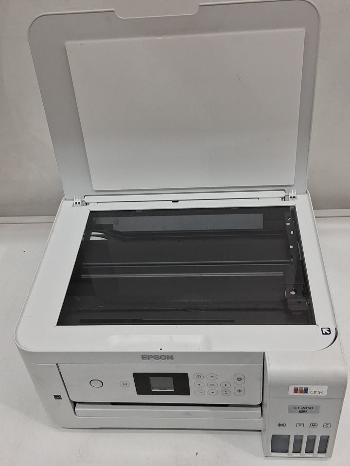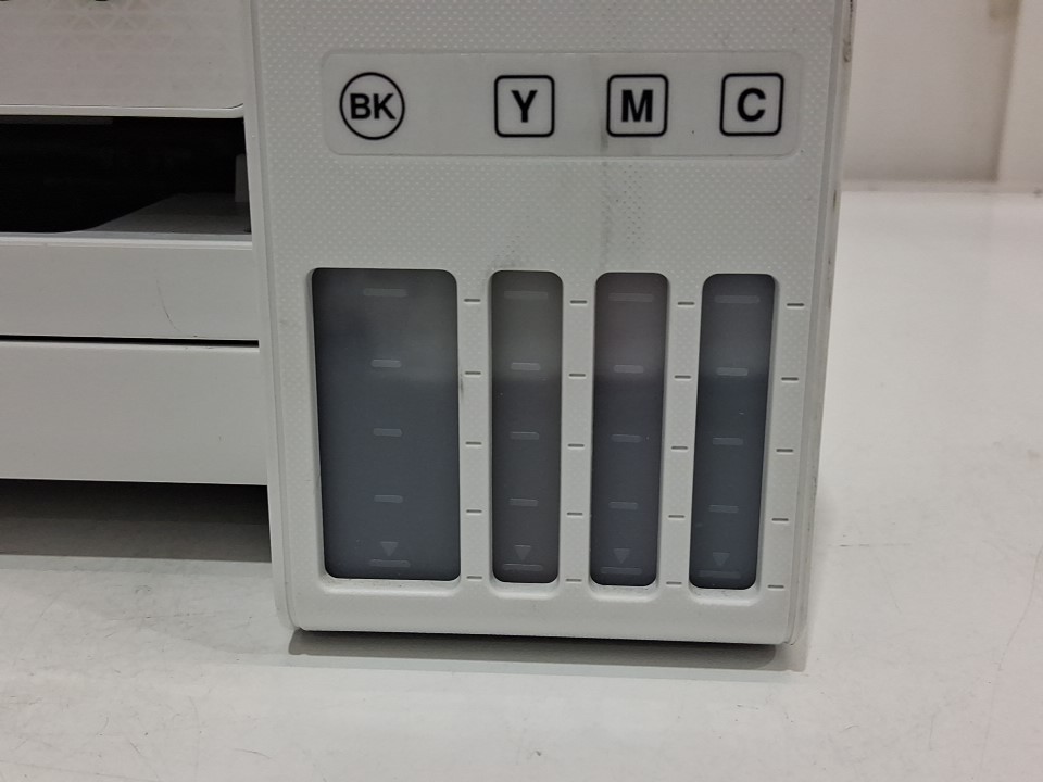 **Tested for power.** Please note that there is an issue with the printer. Once it is switched on, a message appears stating, “The ink pad needs service,” and we are unable to proceed beyond that screen. The printer requires servicing. Additionally, the ink bottles and manual are missing from the original packaging. There are also some ink residues on parts of the exterior and throughout the interior from previous use, see photos.