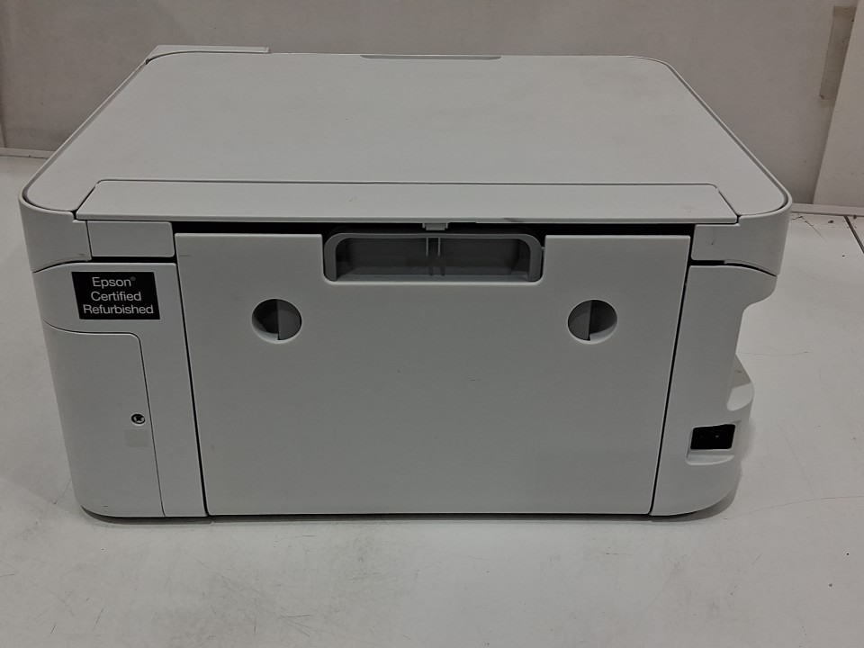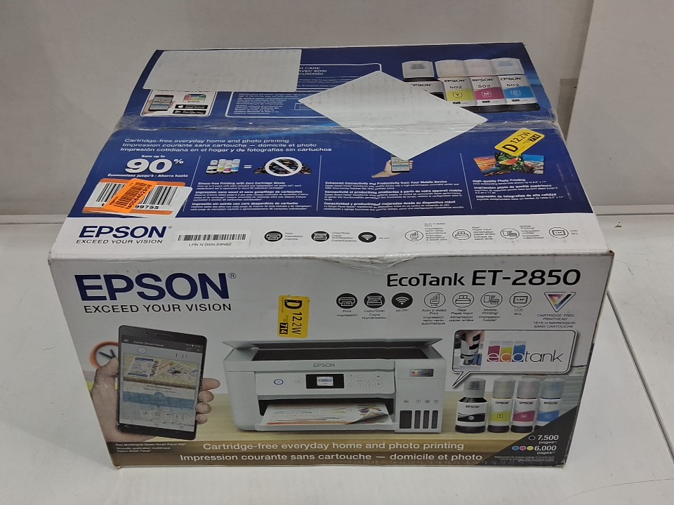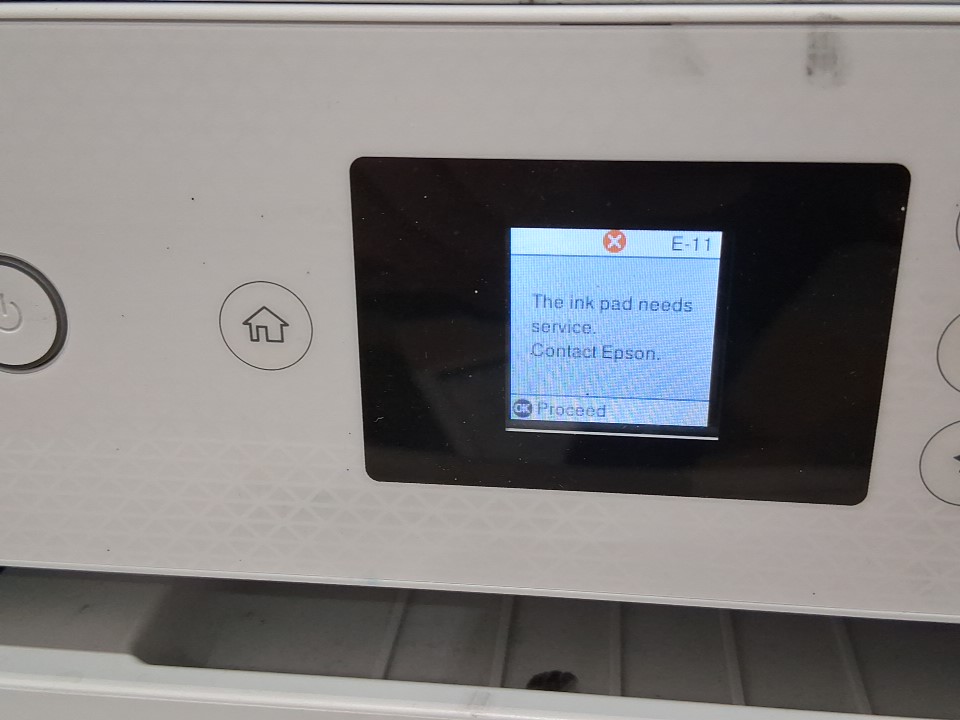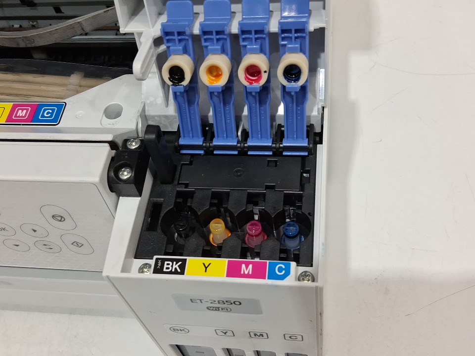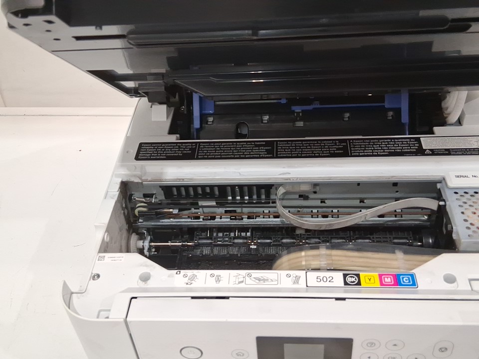 **Tested for power.** Please note that there is an issue with the printer. Once it is switched on, a message appears stating, “The ink pad needs service,” and we are unable to proceed beyond that screen. The printer requires servicing. Additionally, the ink bottles and manual are missing from the original packaging. There are also some ink residues on parts of the exterior and throughout the interior from previous use, see photos.