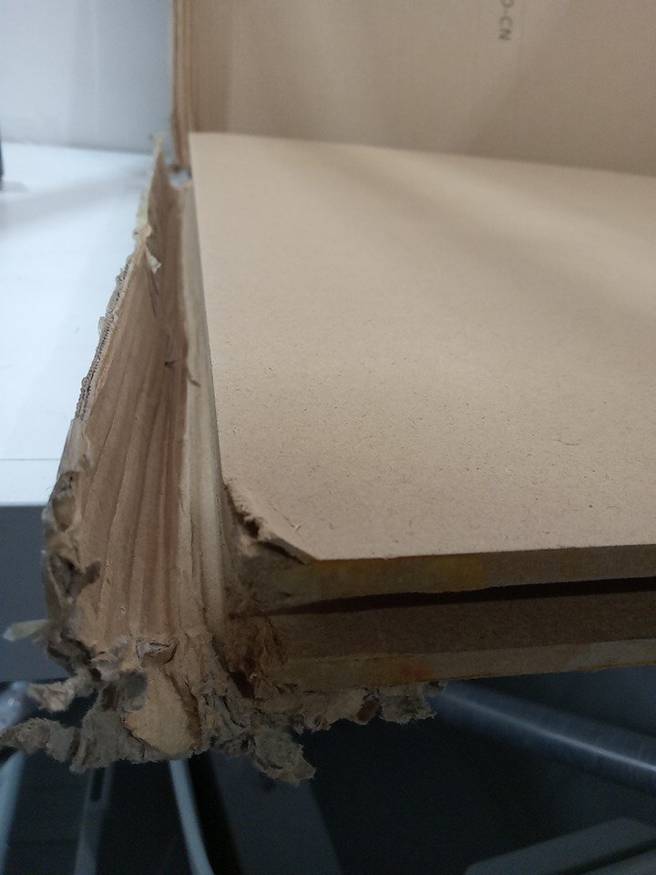 The corner of the two shelf tops are damaged and there are blue scuffs on them from the hardware moving around during shipping/handling.