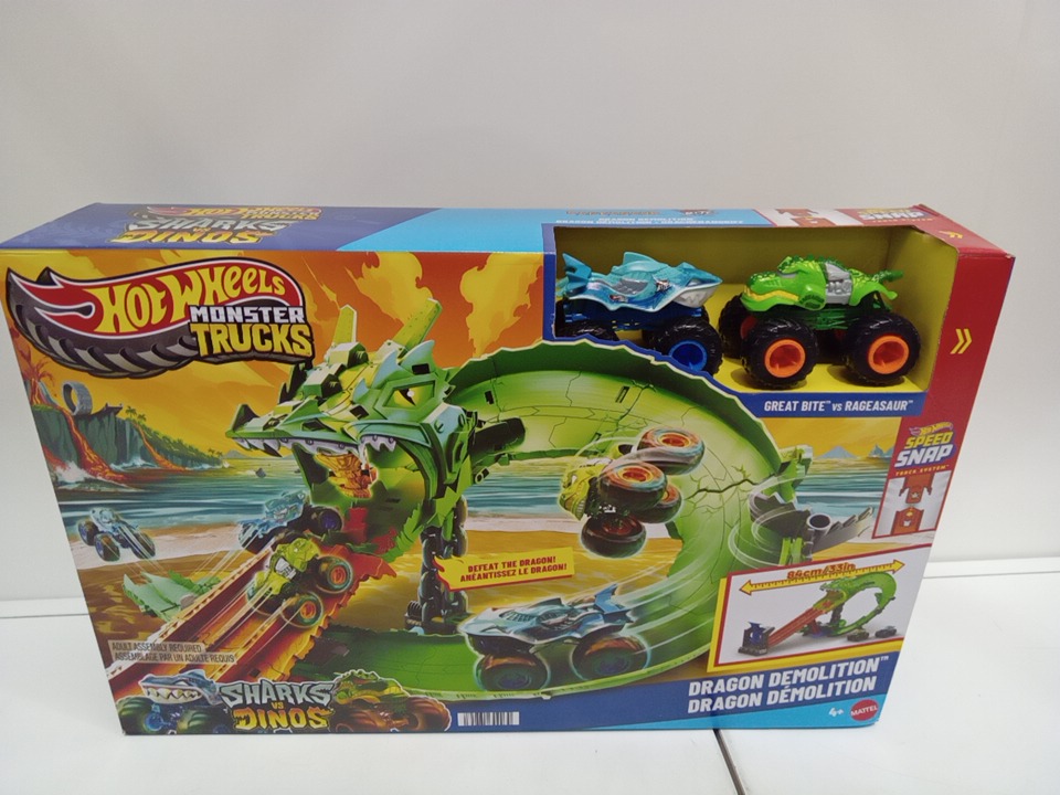 Hot Wheels Sharks vs. Dinos Dragon Destruction Playset with 1:64 Scale Great Bite & Rageasaur - MULTICOLOUR (MODEL: JGB06)