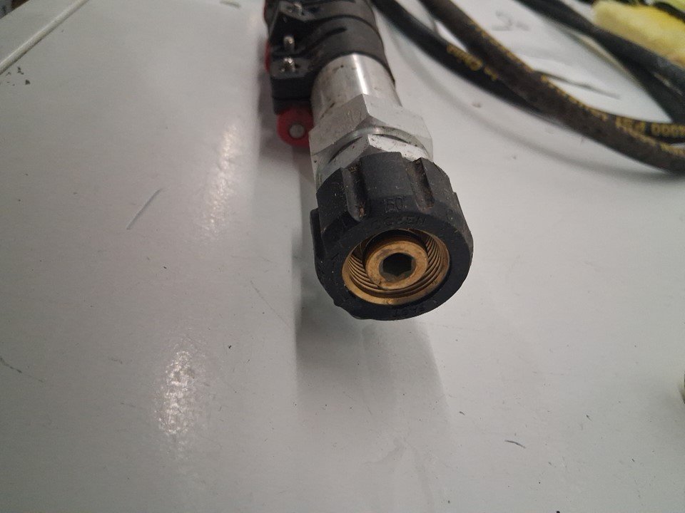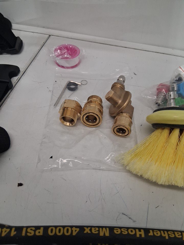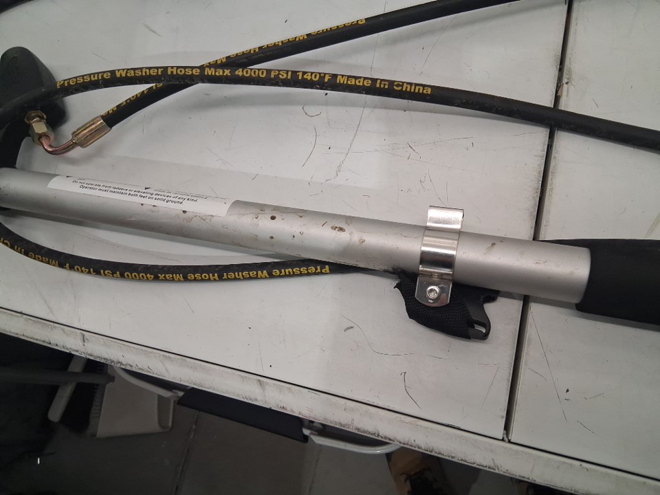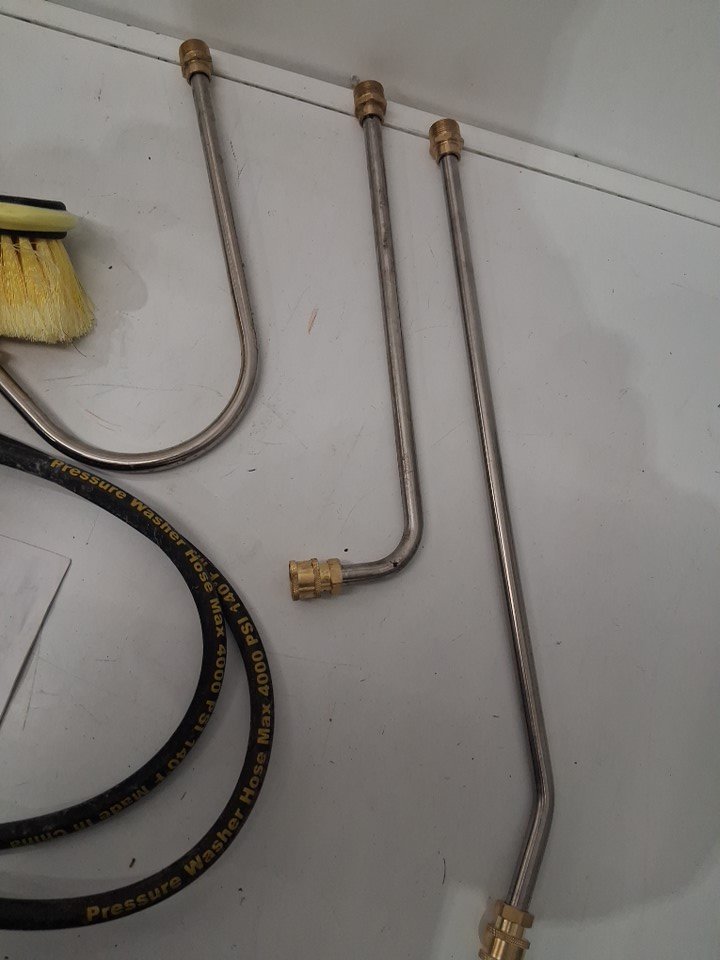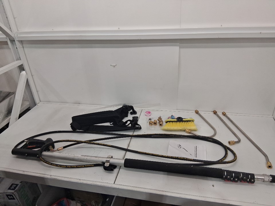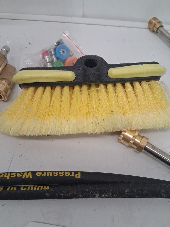pressure washer wand has dirt water spots on it and some pieces. Hose is visibly dirty. Unable to test