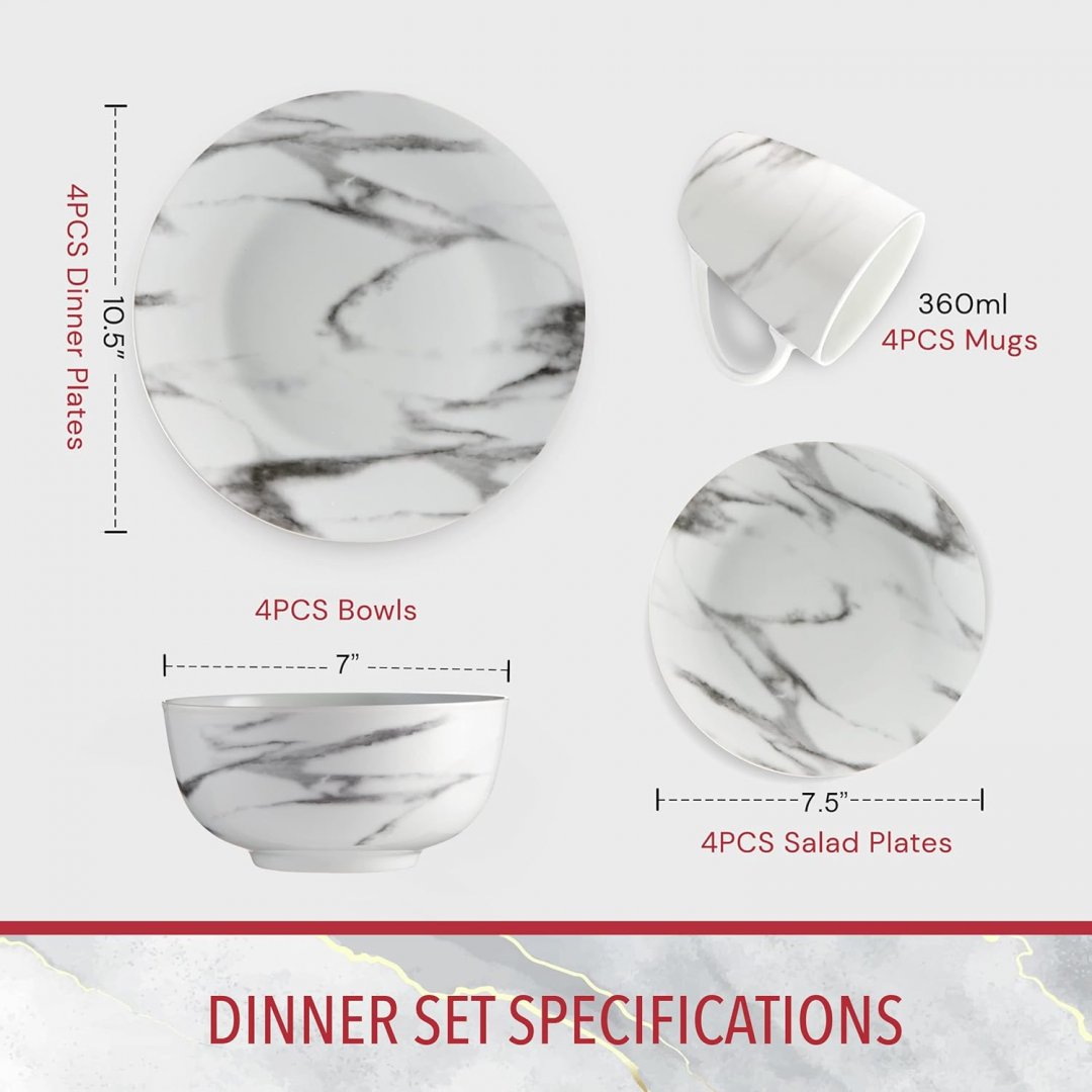 Available Sizes: -Dinner plates (4 x 10.5") -Salad plates (4 x 7.5") -Bowls (4 x 6") -Mugs (4 x 360ml)