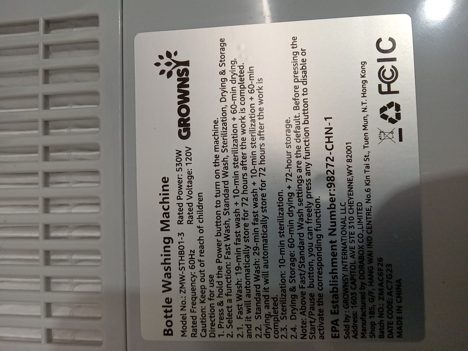 GROWNSY ALL-IN-ONE BOTTLE Bottle Washer and Sterilizer and Dryer MACHINE WITH detergent tablets- WHITE (MODEL: ZMW-STHB01-3)