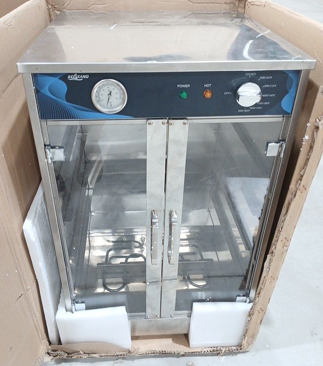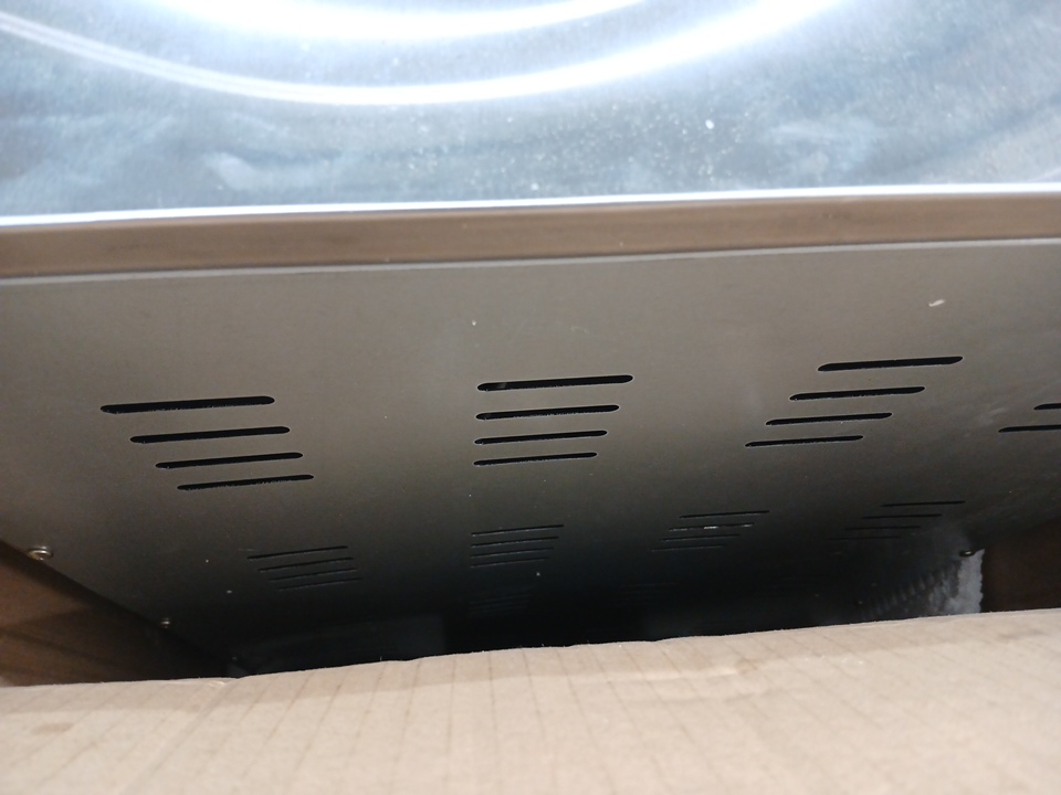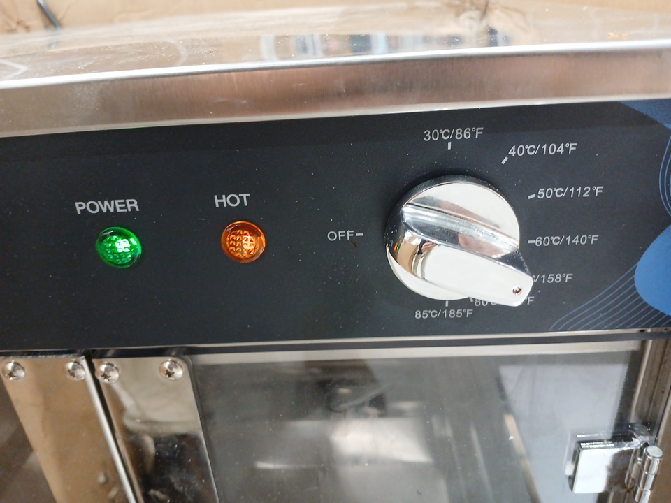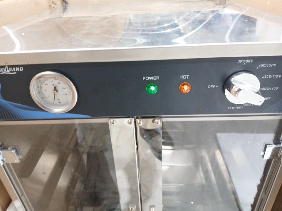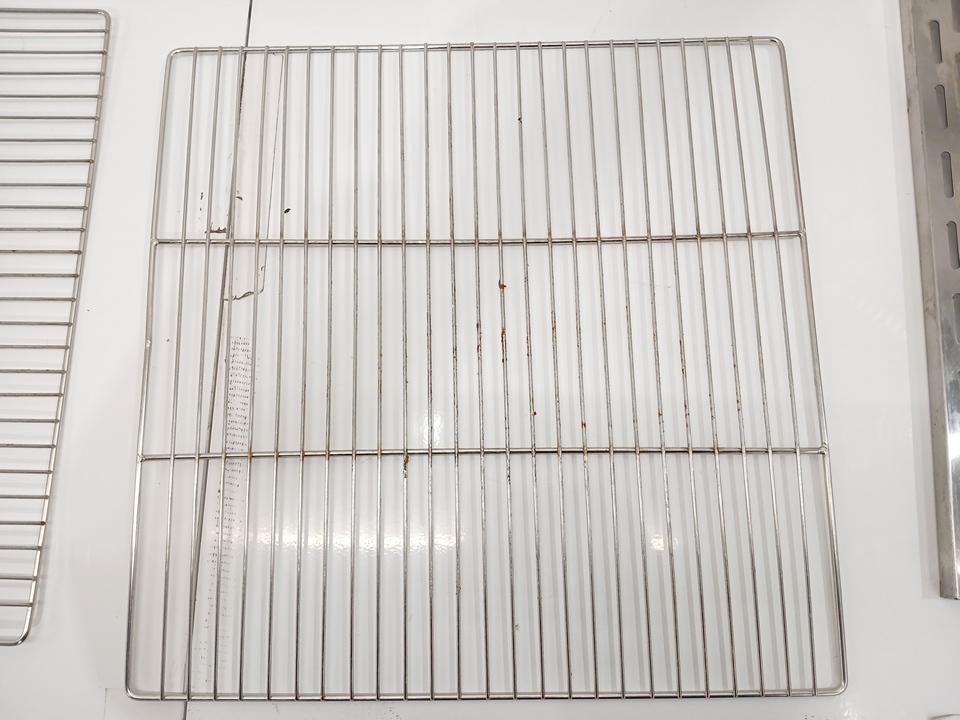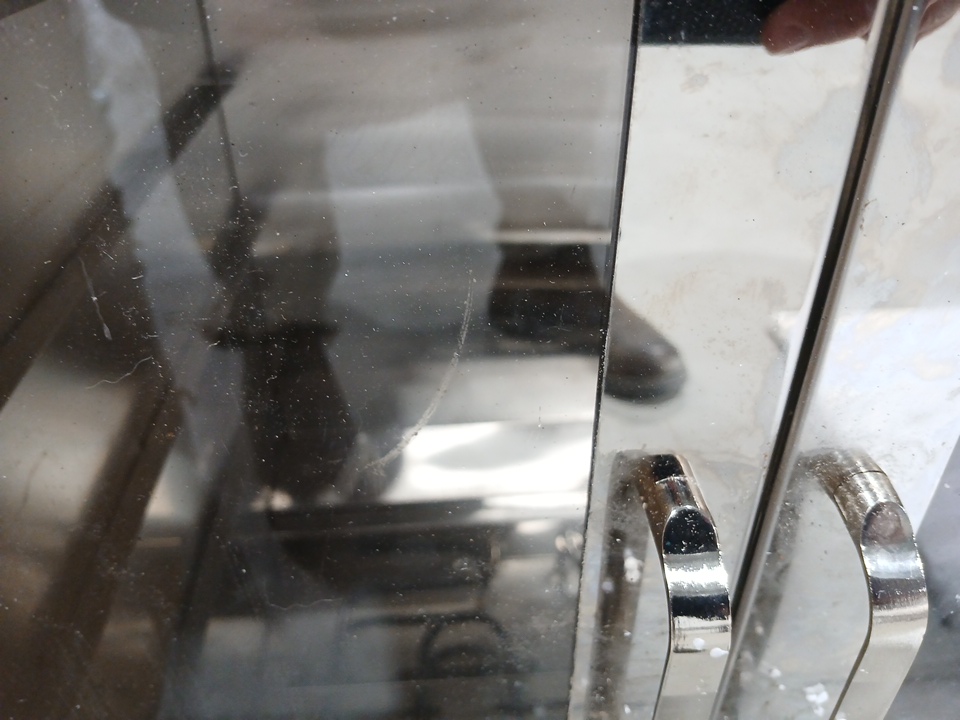 This item has a lot of finger marks on its metal, is dirty, the racks have burnt food remains, and there is a scratch on the glass door. This item has been tested for power.