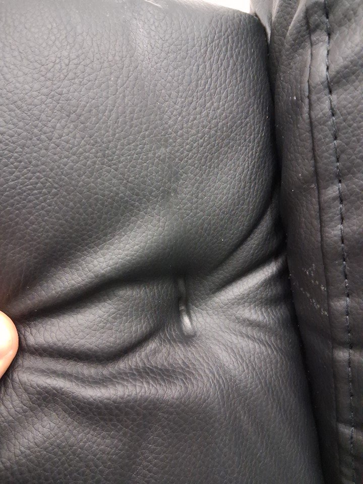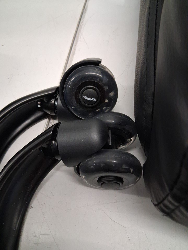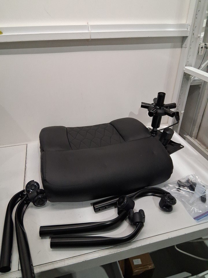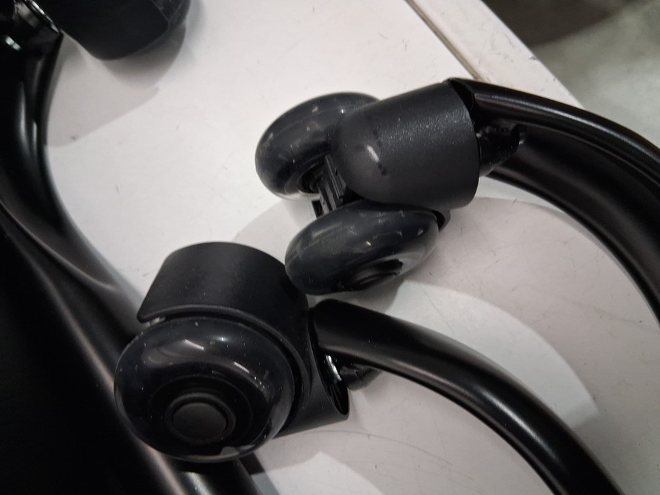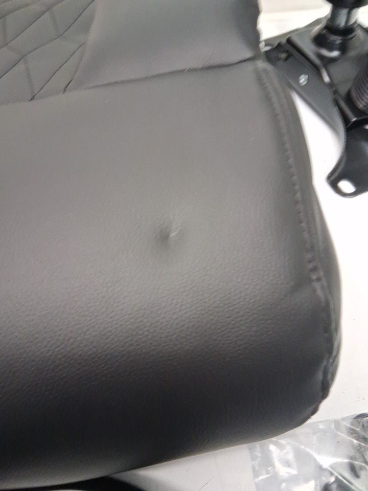 Dirt on wheels from prior use- parts of the seat/back have some indents from being improperly packaged- unsure if these will go back to normal with time (see photos)