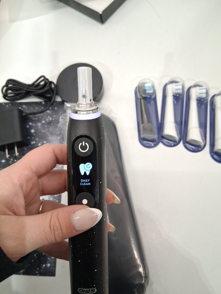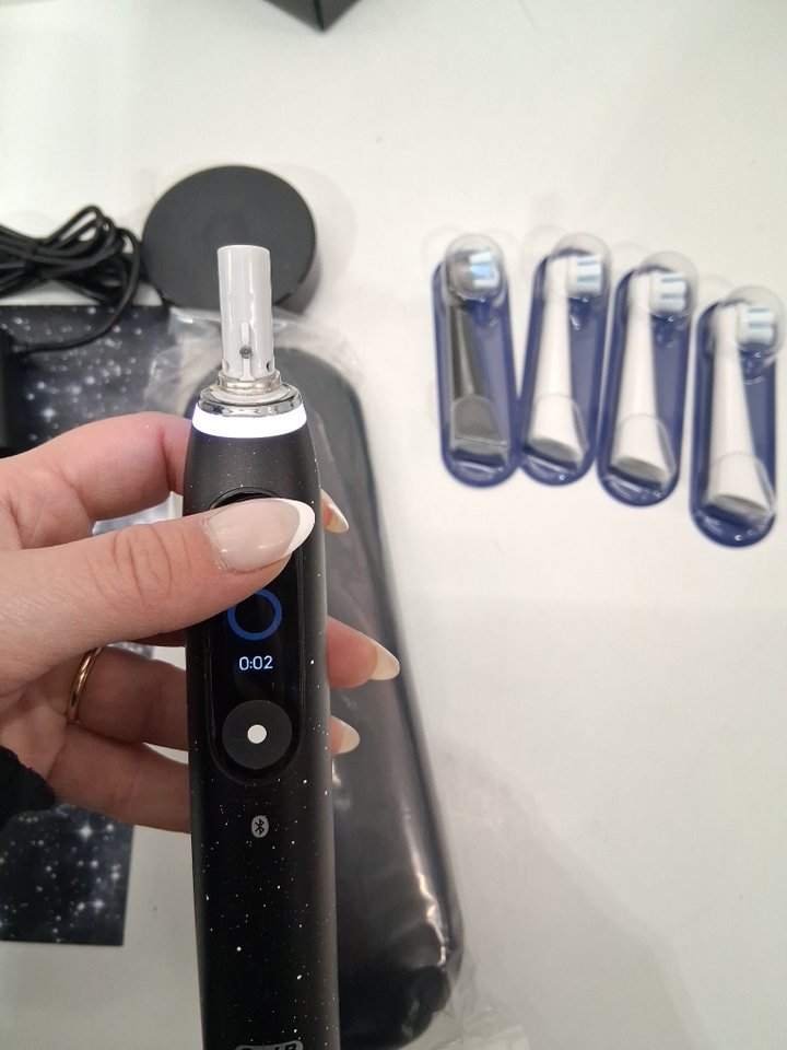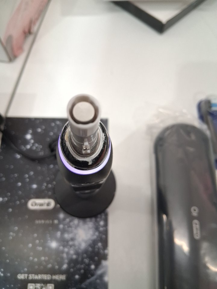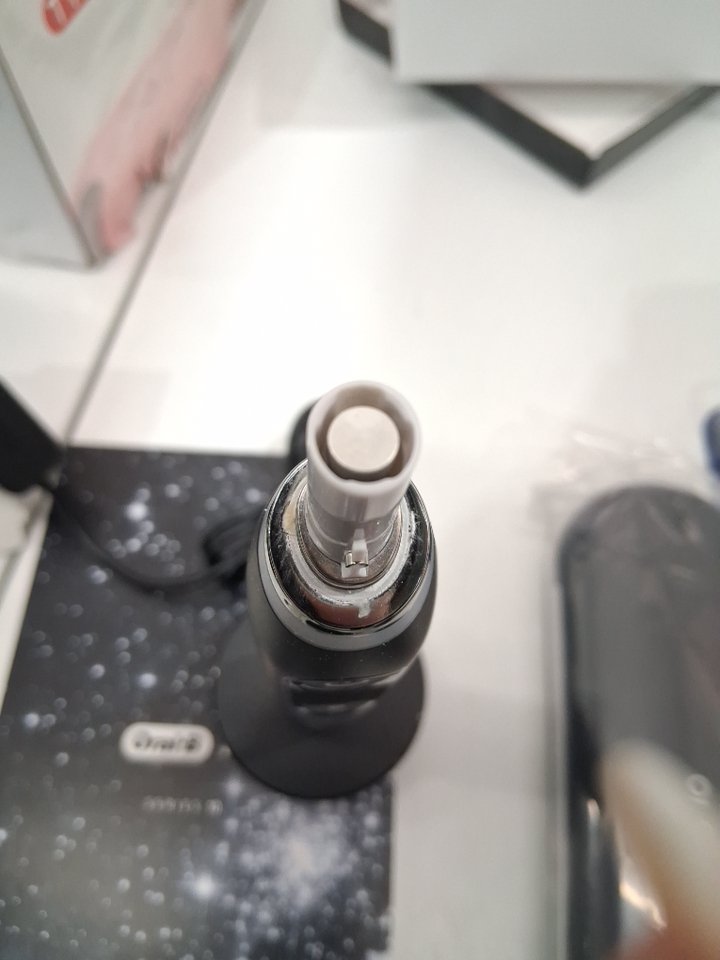 here is a bit of toothpaste residue on the brush handle and We have replaced the opened brush head with a sealed one. Please see photos. We recommend doing a personal clean of this item before use.