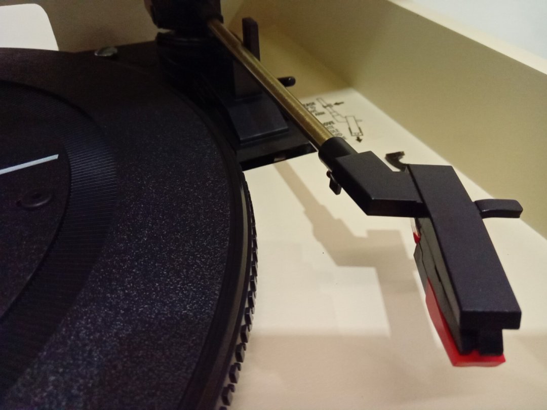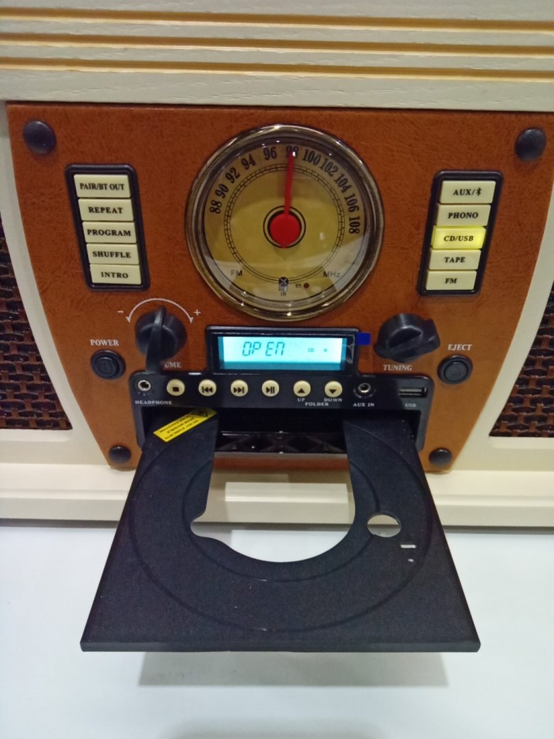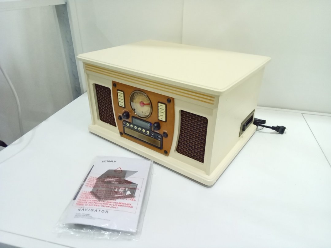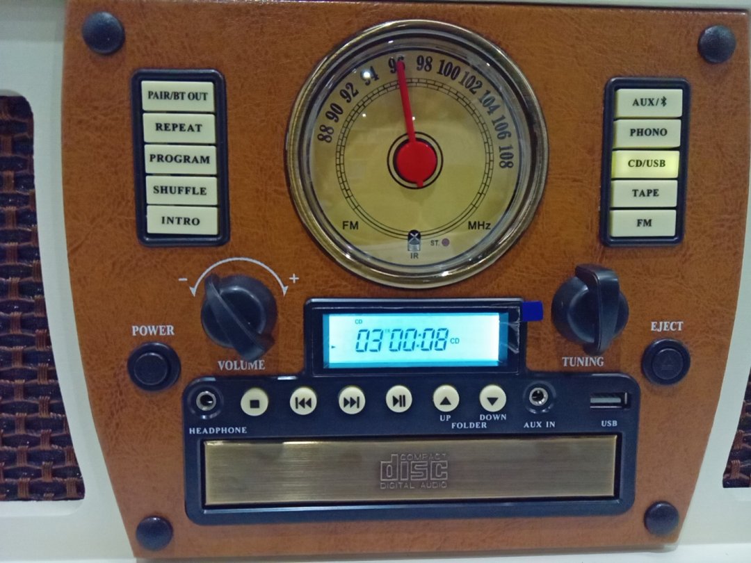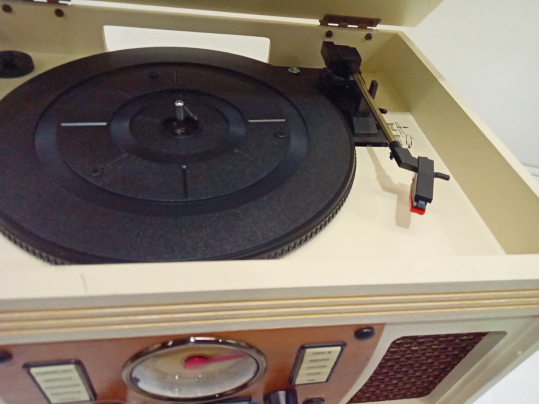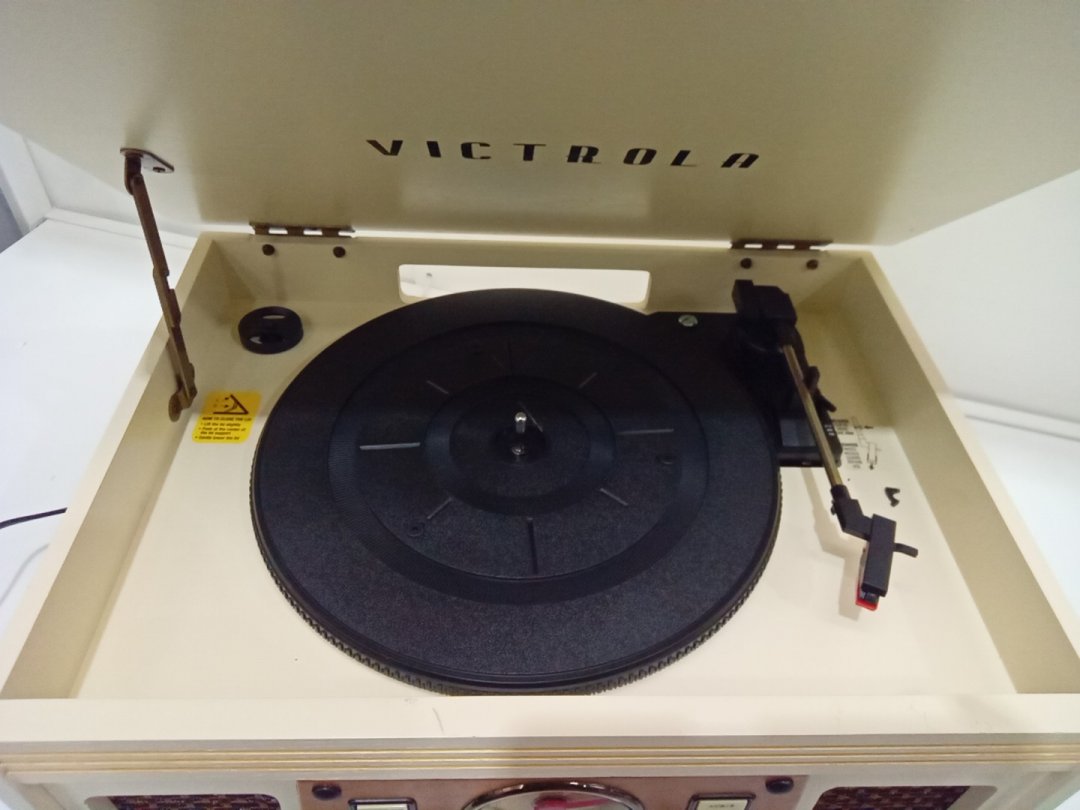 scratch marks on the front edge under the lid suggests prior use. the part that holds the phonograph arm when not in use has broken off. please see photos.