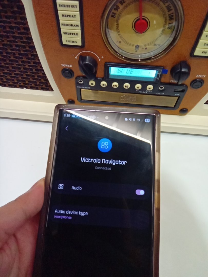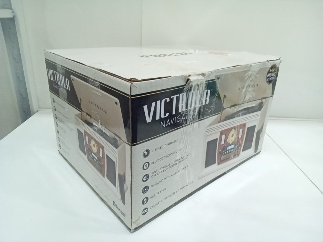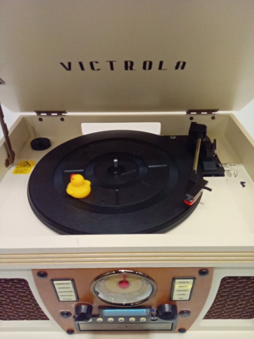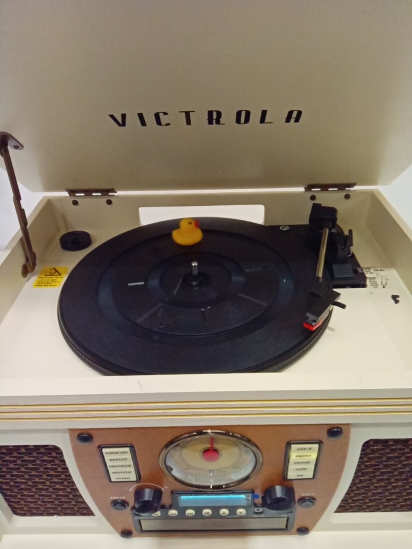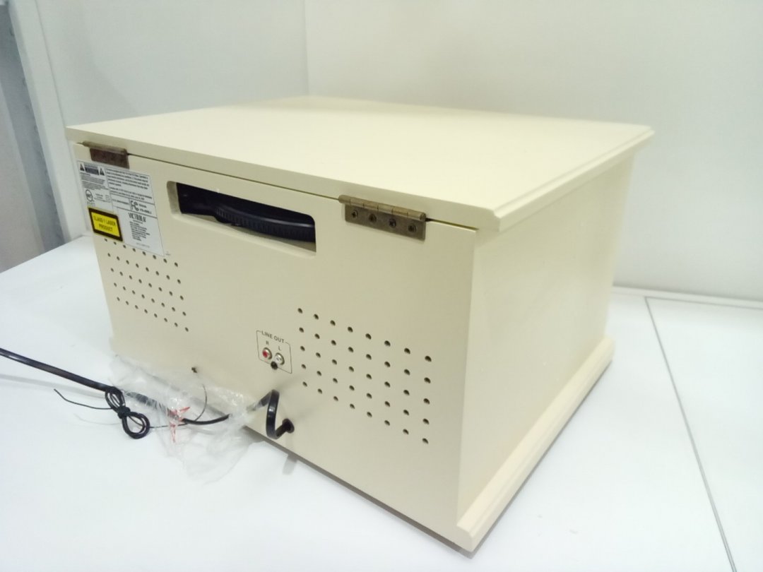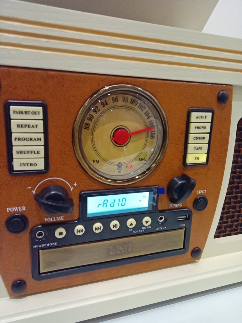 scratch marks on the front edge under the lid suggests prior use. the part that holds the phonograph arm when not in use has broken off. please see photos.