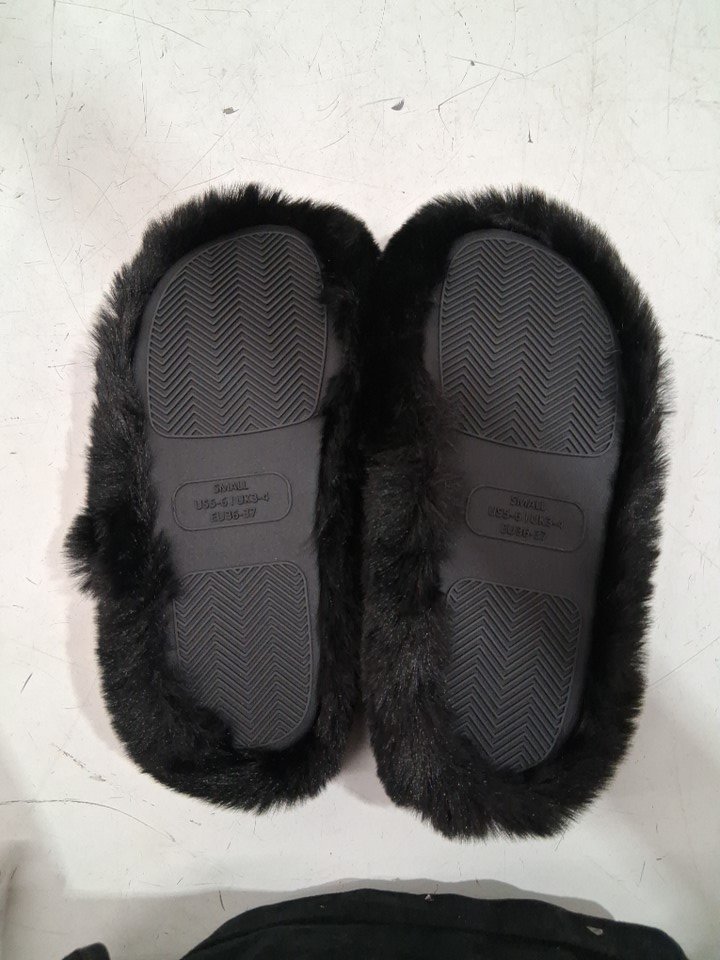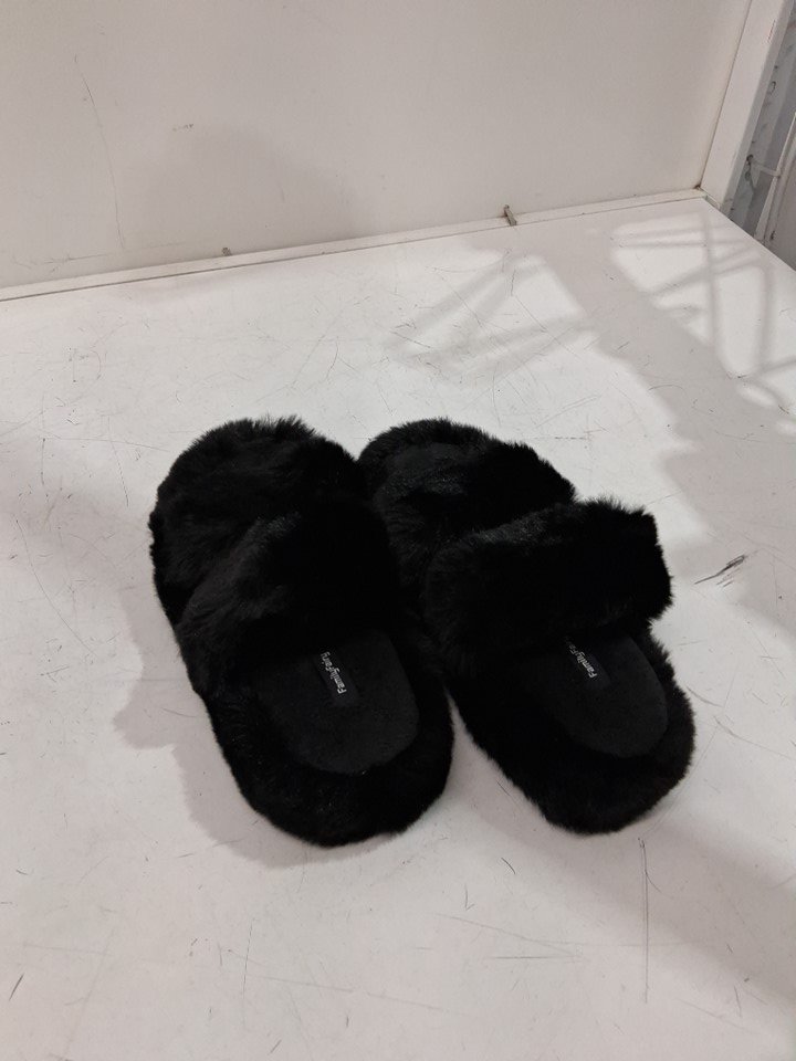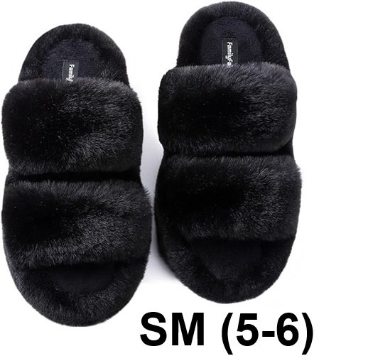 WOMENS FAMILYFAIRY FAUX FUR OPEN TOE TWO BAND SLIPPERS - SMALL (5-6) - black