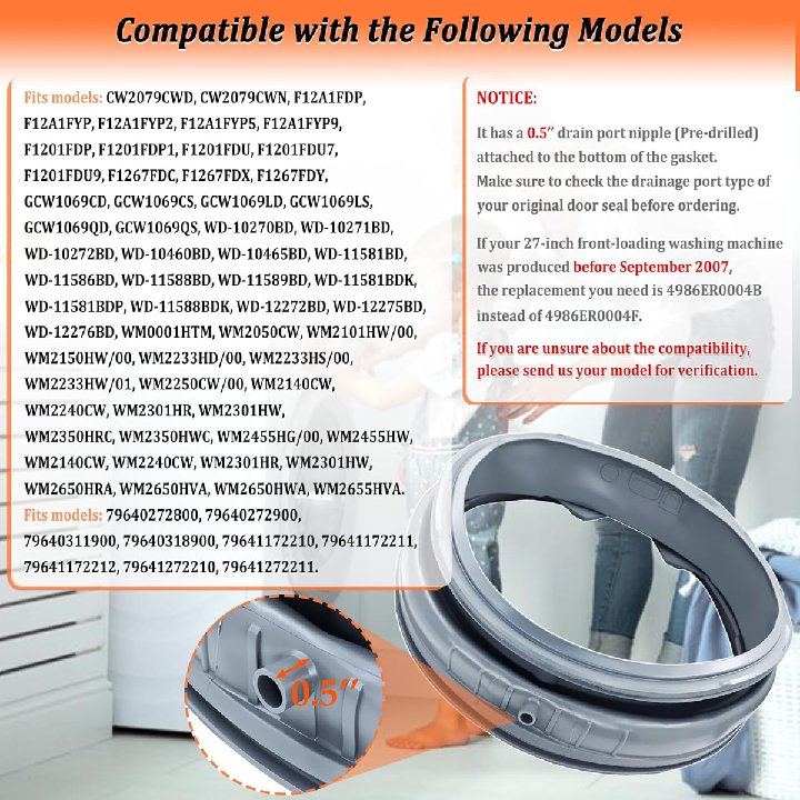 Upgraded Washer Door Gasket Boot Seal Diaphragm Door Seal - Grey (Model: 4986er0004f)
