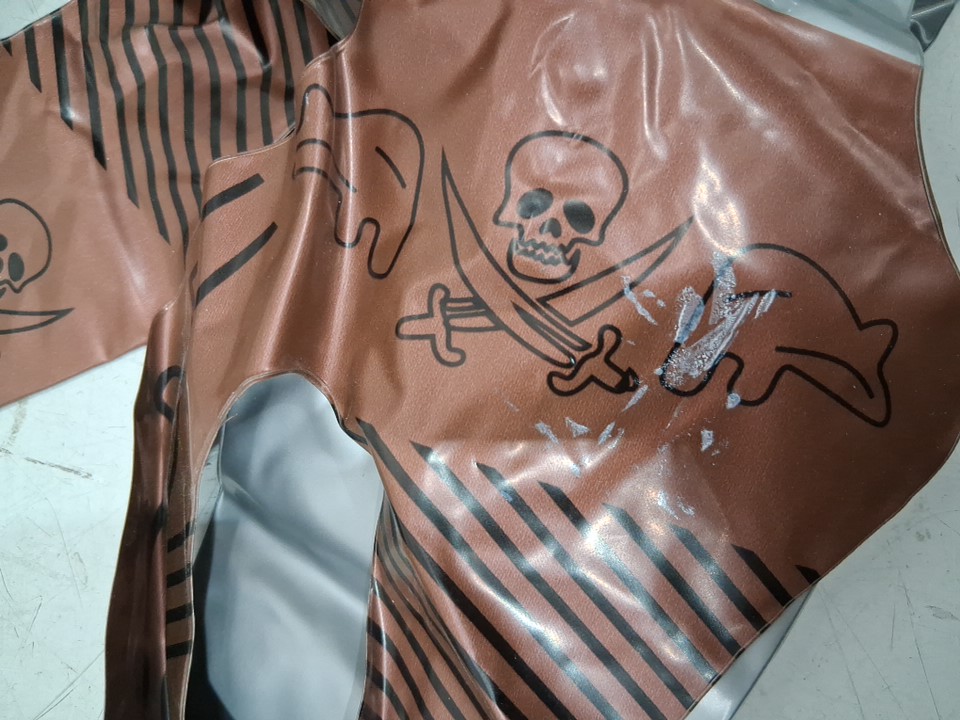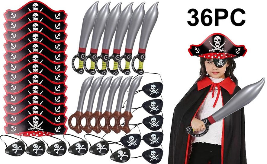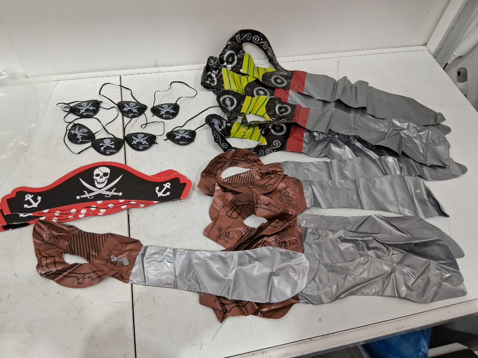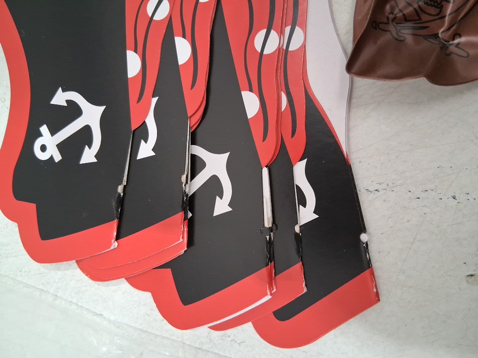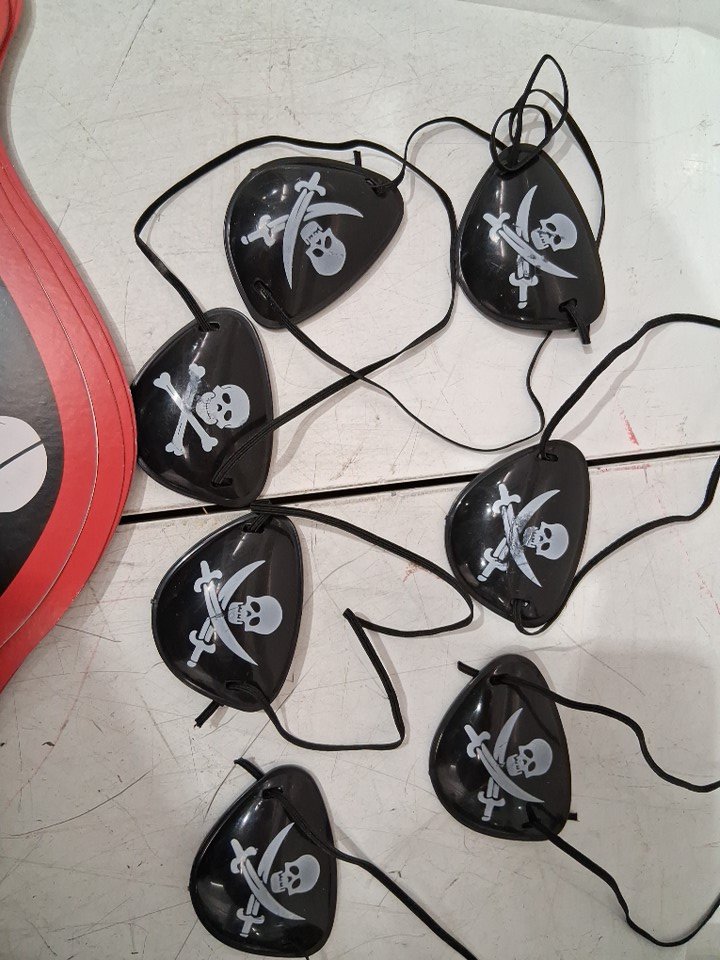 please note the pack is missing some eyepatches as well as pirate hats. there is some smudging of the design on some of the eyepatches, as well as markings on one of the swords. see photos.