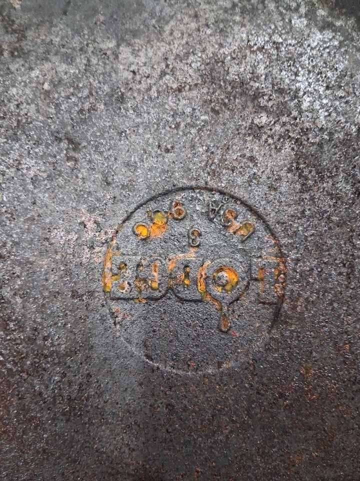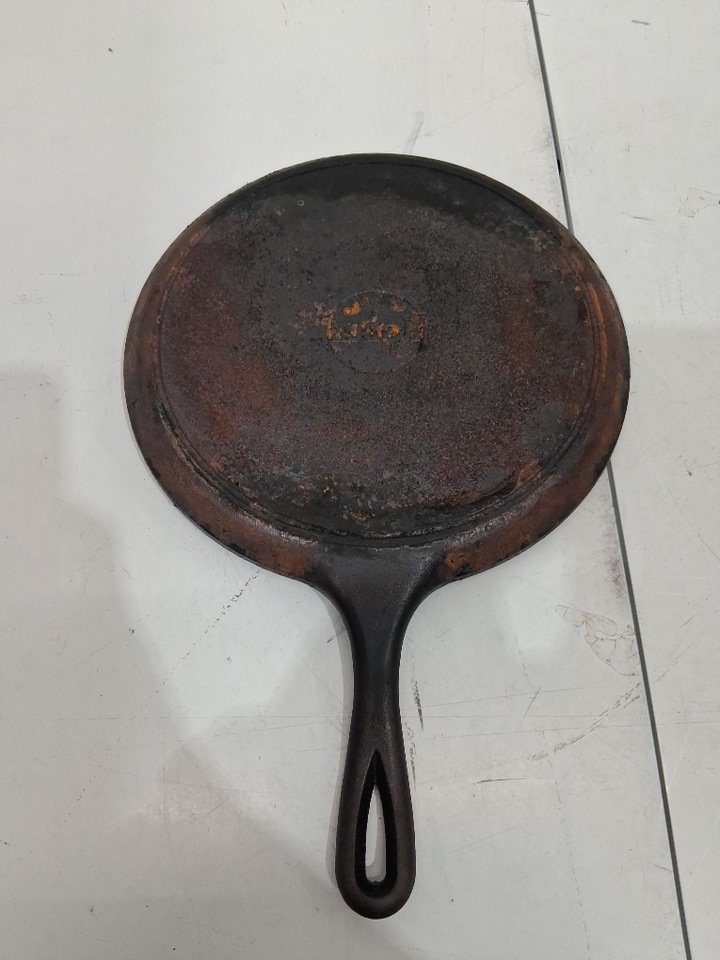 Item shows signs of previous use and distress such as rust on bottom/top of pan.