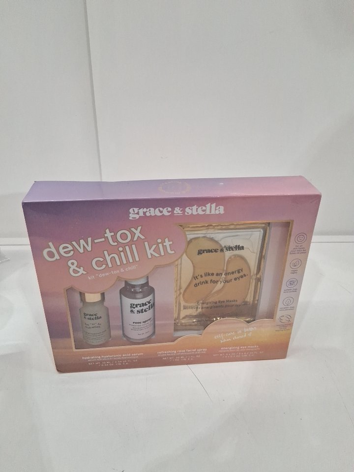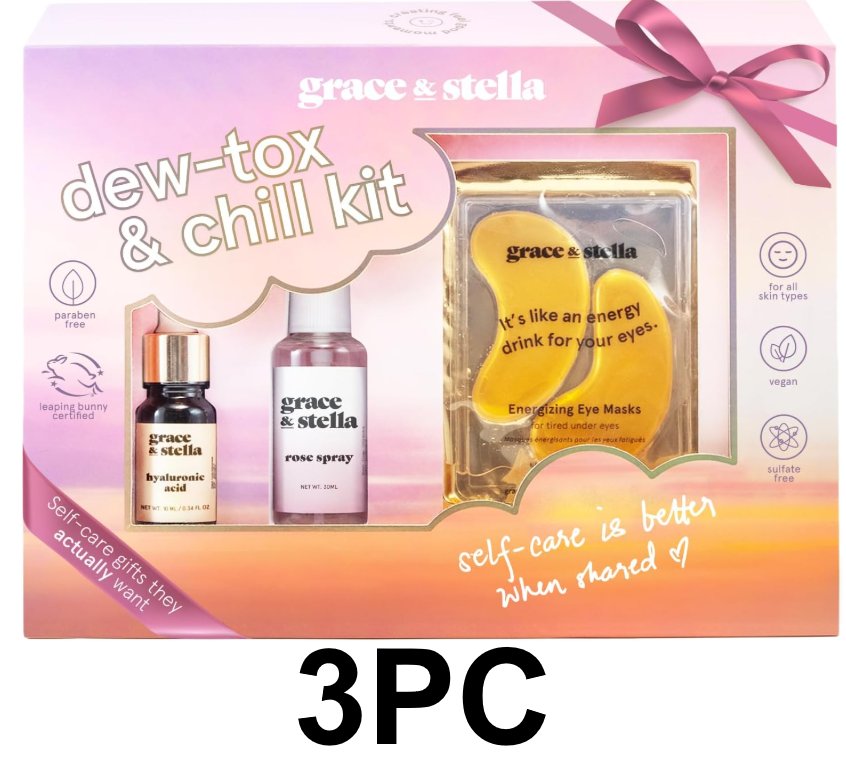 grace & stella Skin Care Set DEW-TOX & CHILL KIT Travel Essentials with Gold Eye Masks Hyaluronic Acid Serum & Rose Spray
