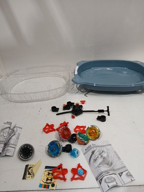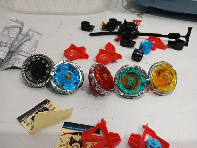 One of the beyblades are missing, and parts are scattered inside of the box so we cannot guarantee all components are there. TOTAL: 5PC