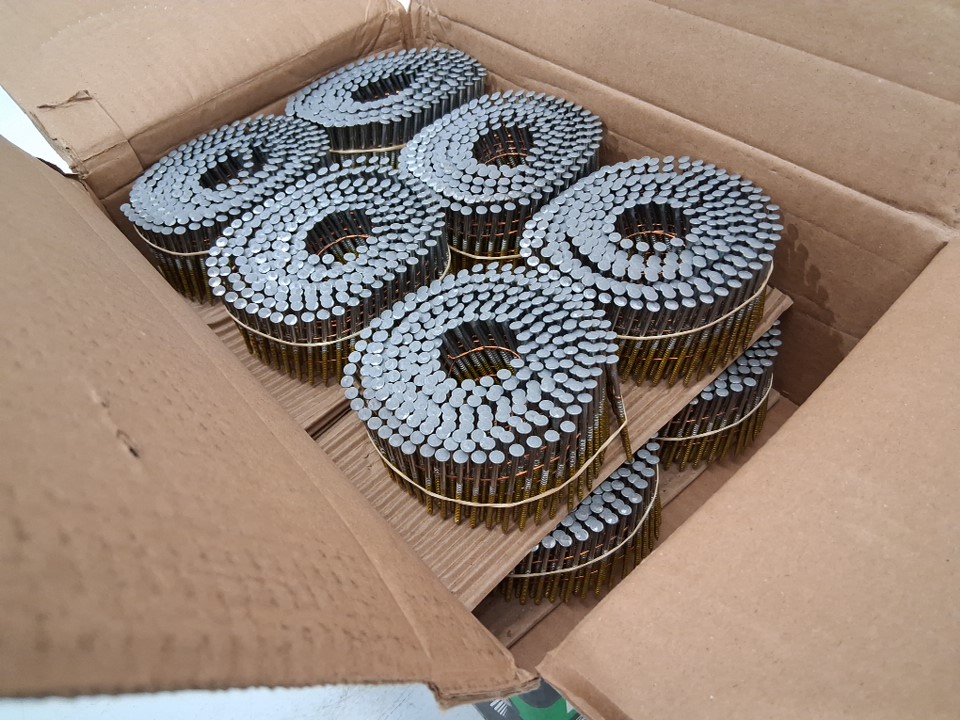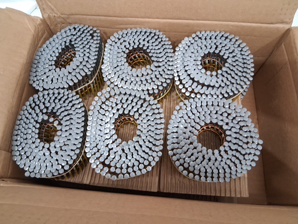 APPROX 3600PK HITACHI Full Round-Head Ring Shank Hot-Dipped Galvanized Wire Coil Siding Nails - 2.25" x 0.092" (MODEL: 13367)