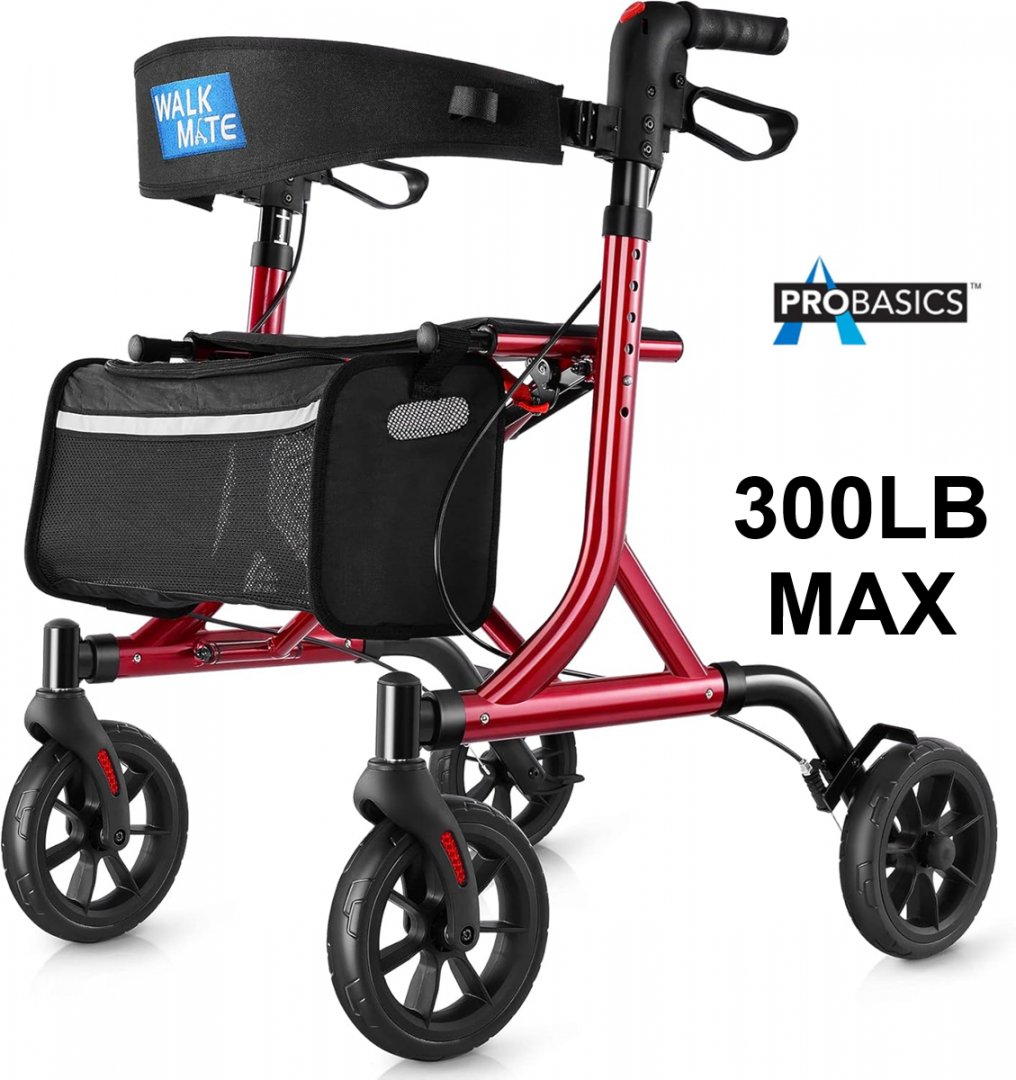 Walk mate PROBASICS senior ROLLATOR ultra-light, foldable and ADJUSTABLE HEIGHT - 300LB MAX - red (MODEL: ‎WM02060-RD)