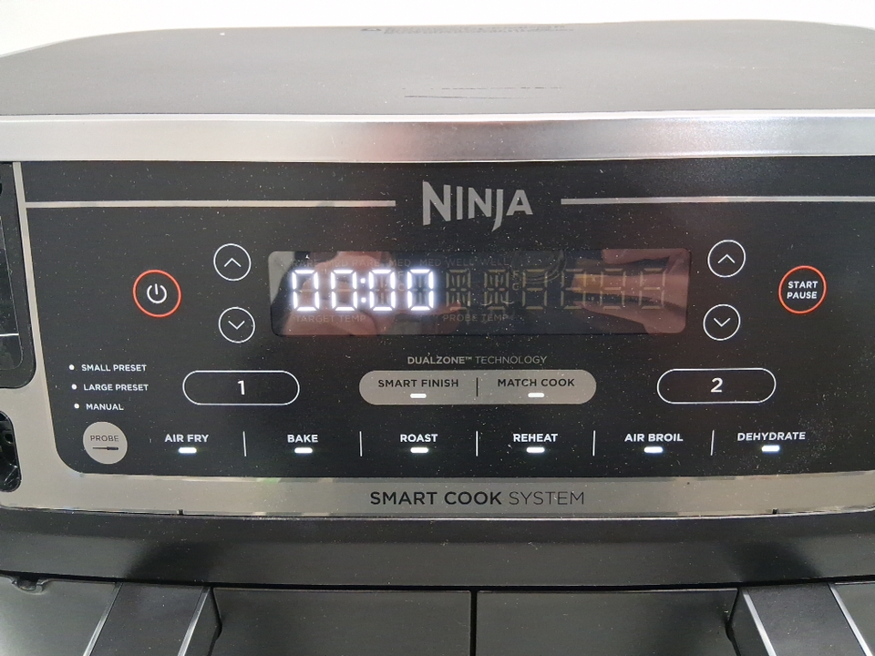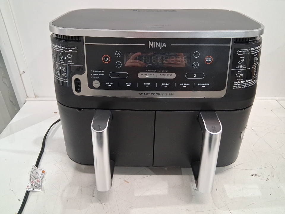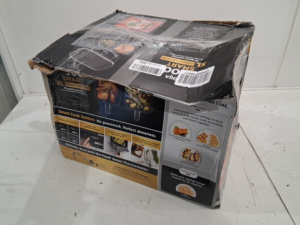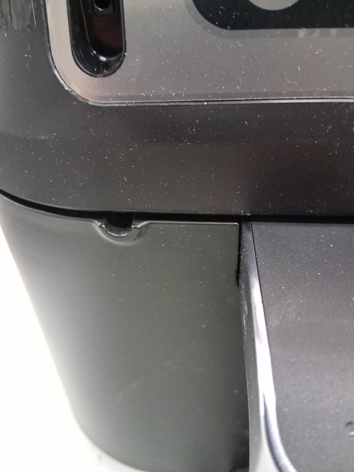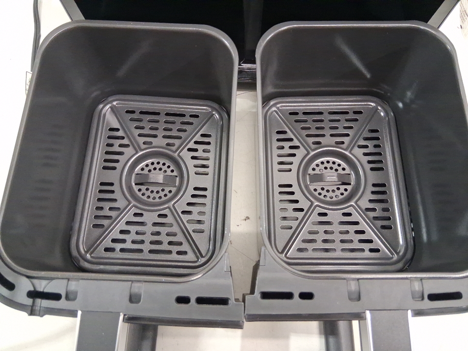 Please note: • The air fryer shows signs of previous use with dust and smudging around the outside. • The left bucket has a dent/hole on the lip, see photos.